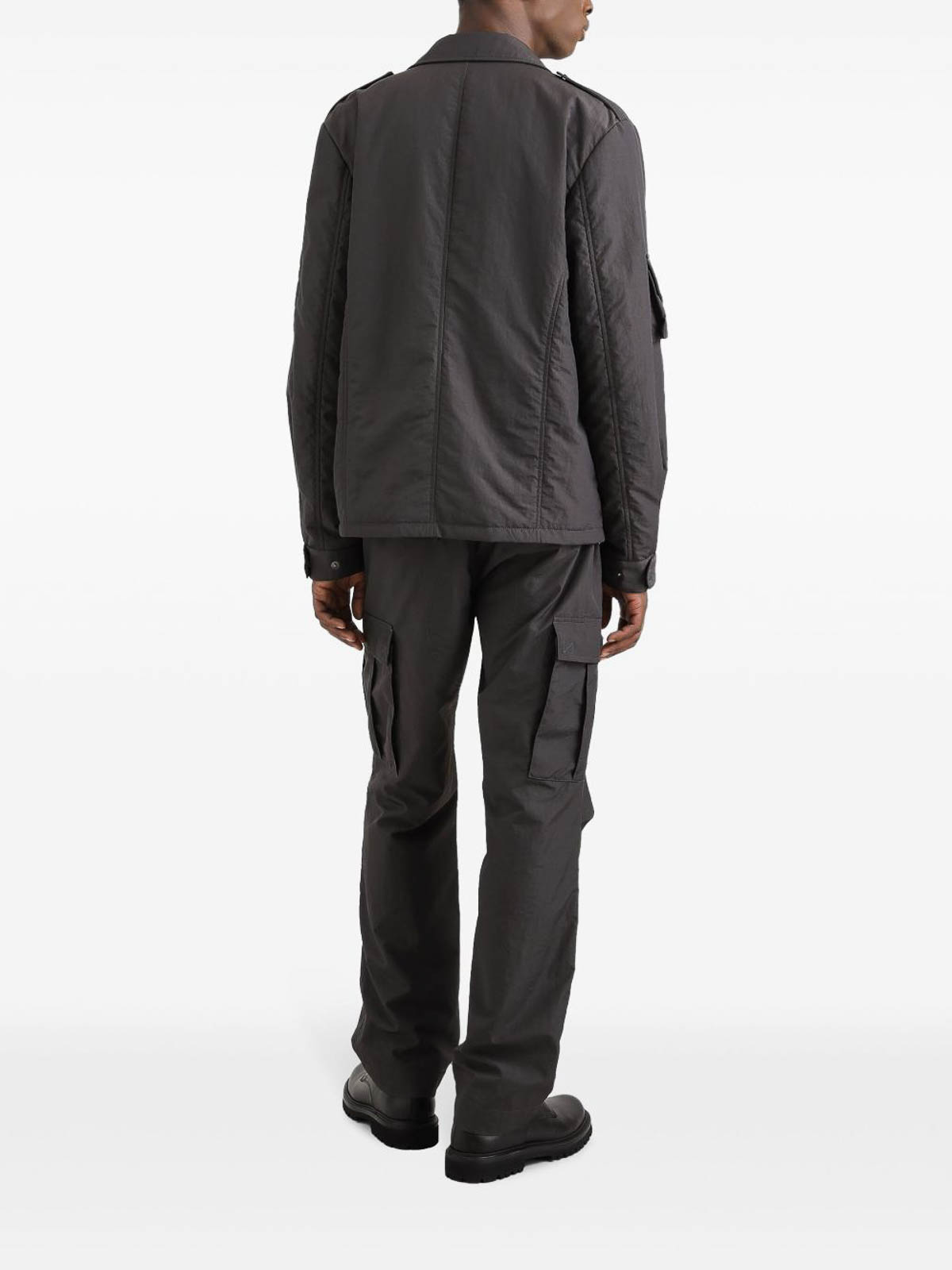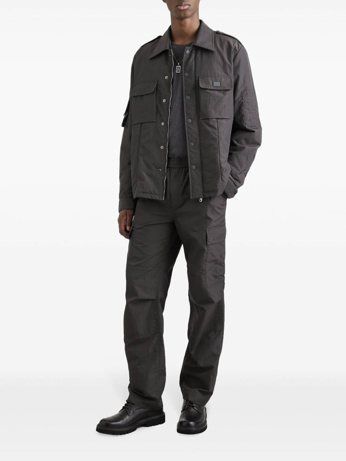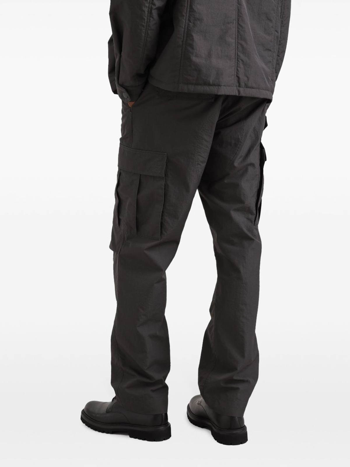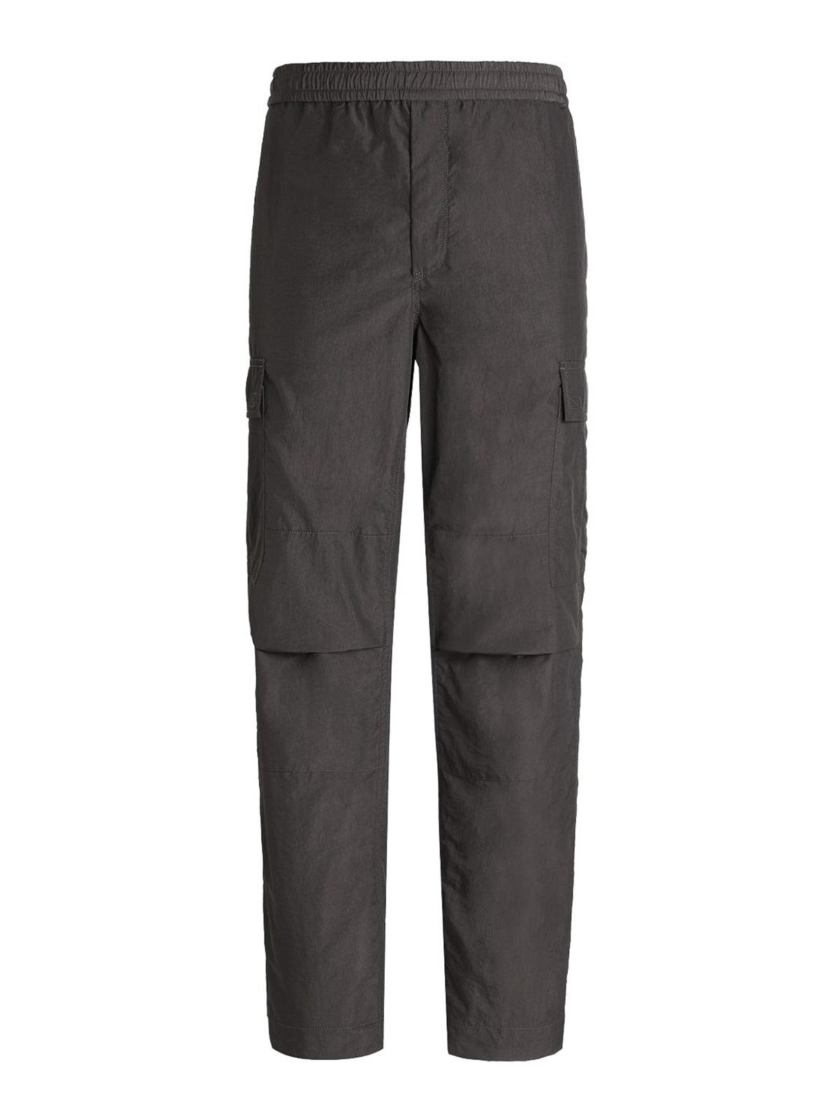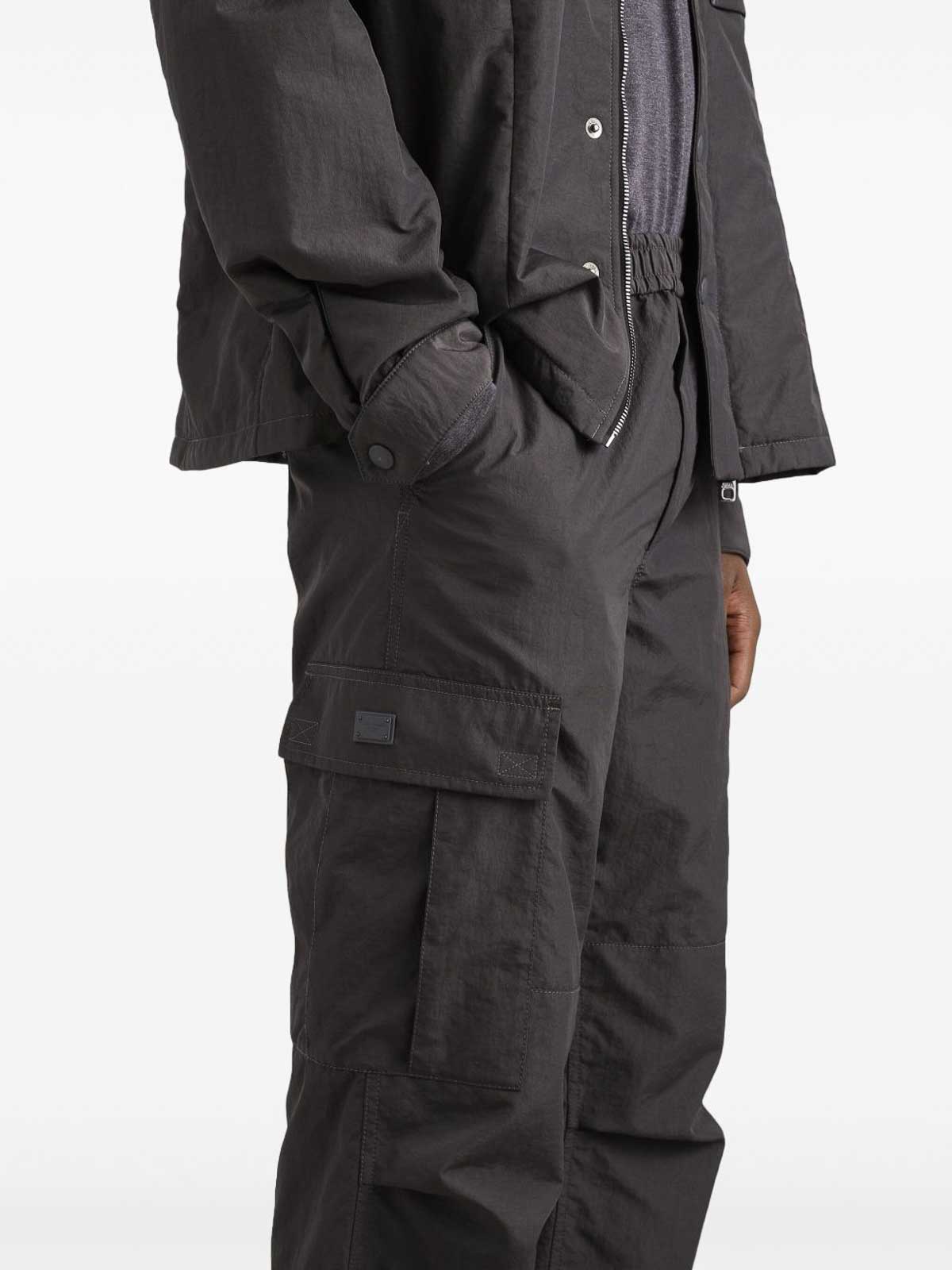 Cargo pants in technical elasticized waist button and hidden zip side patch pockets with flap and button french pockets back pockets with flap and button drawstring at the bottom