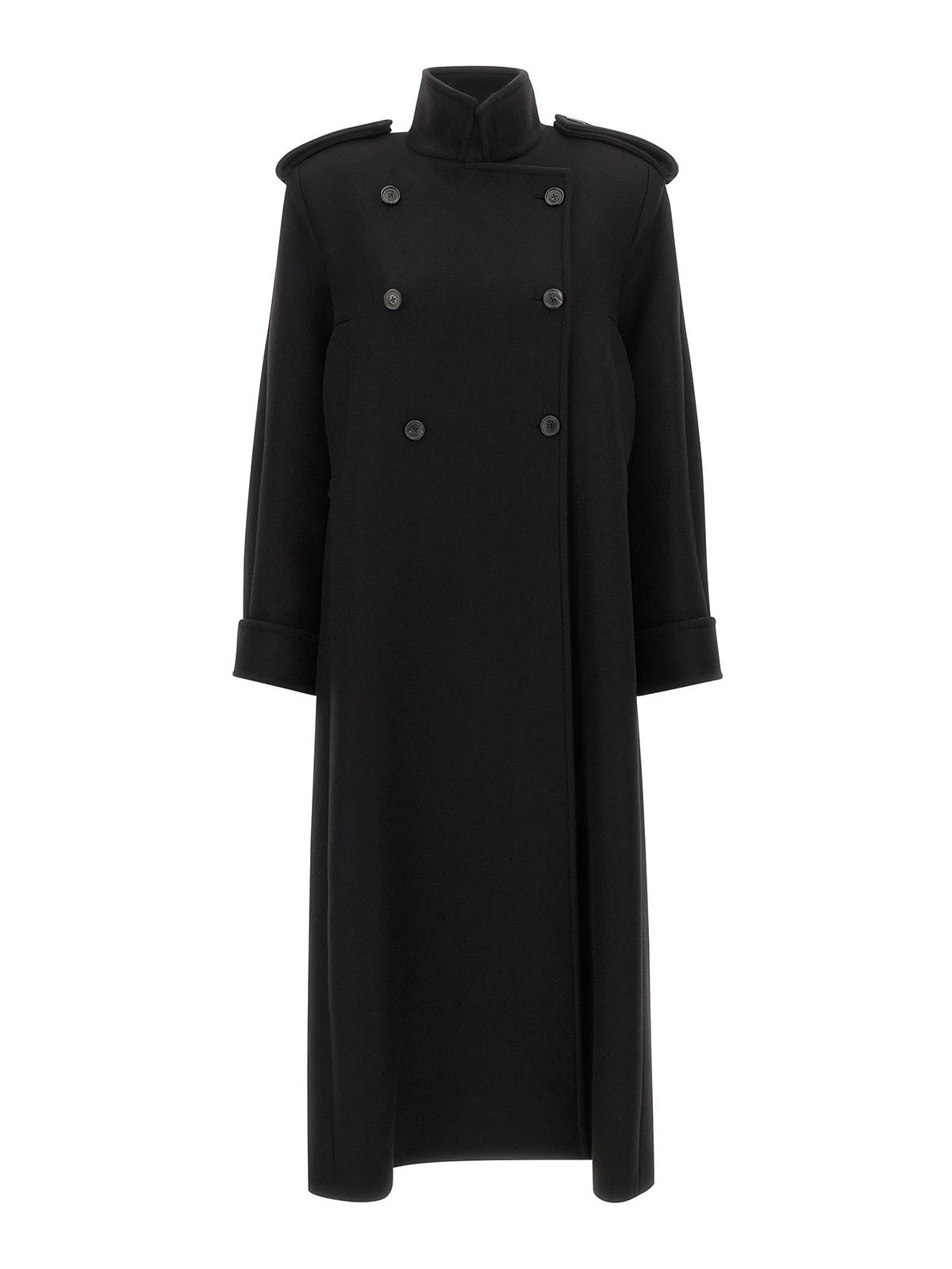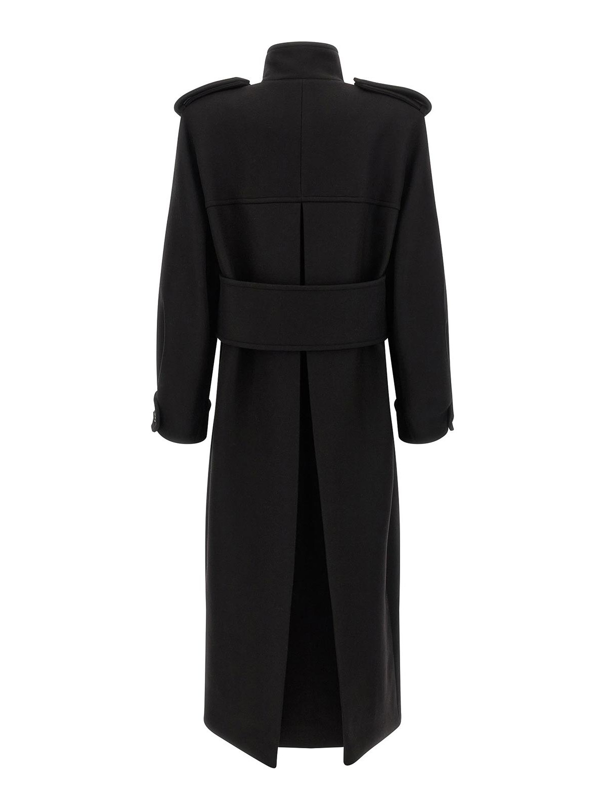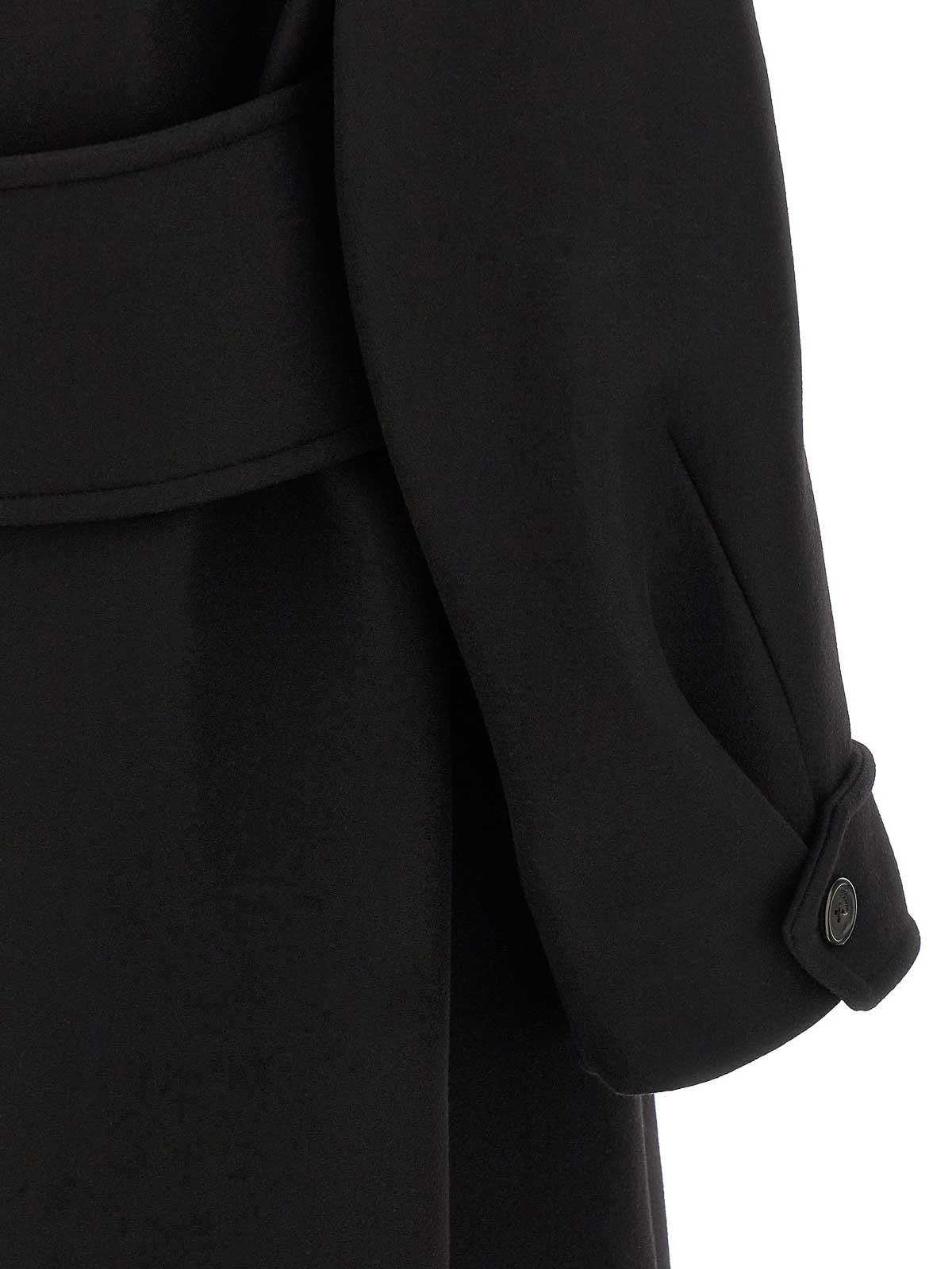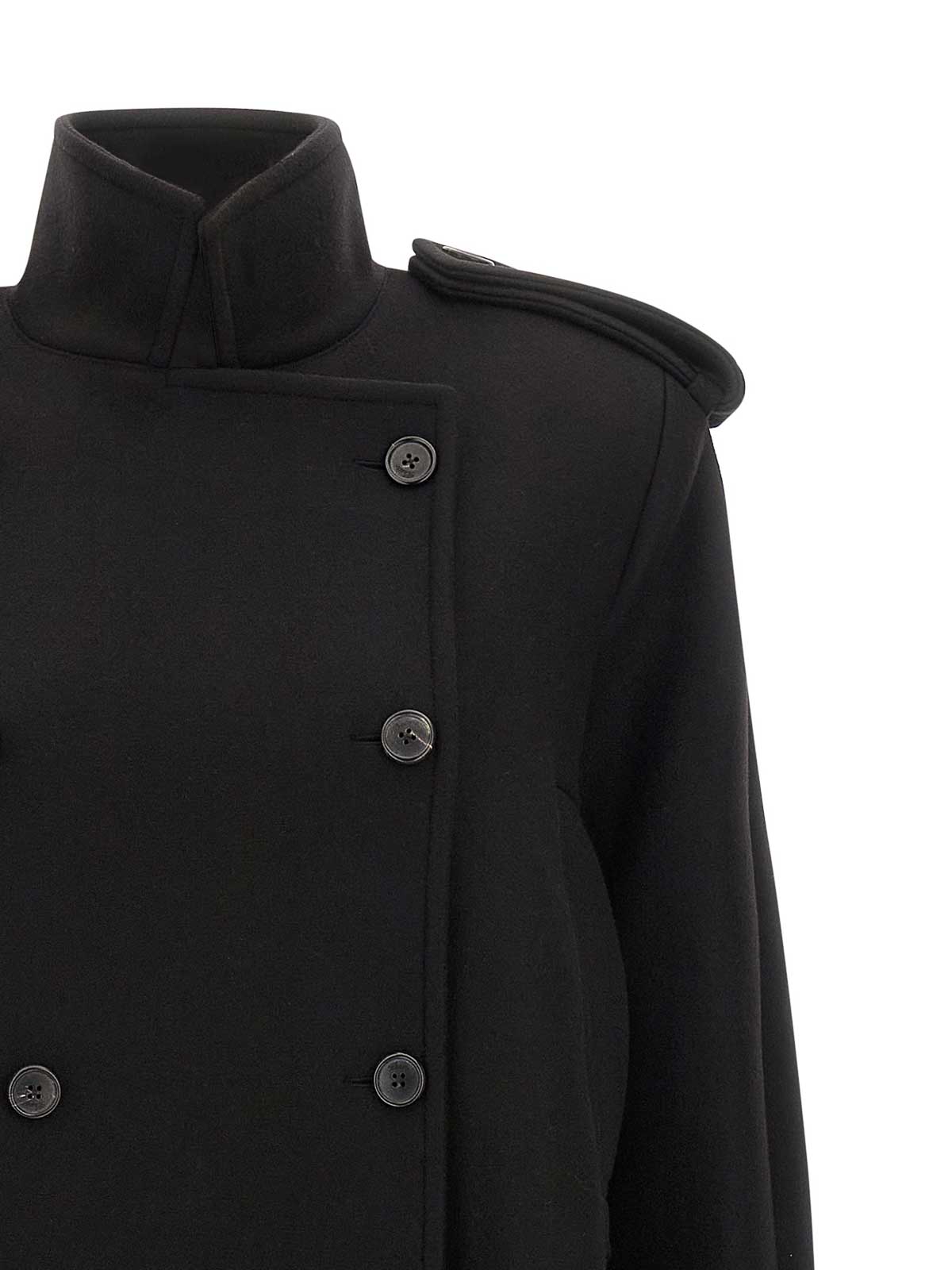 Donna' compact melton coat with silky cupro twill lining, double-breasted style with front button closure, high neck, welt pockets, padded shoulder strap with shoulder pad, long sleeves with adjustable cuffs, deep back inverted pleat with belt.