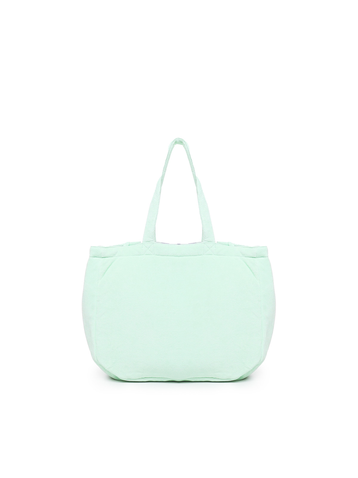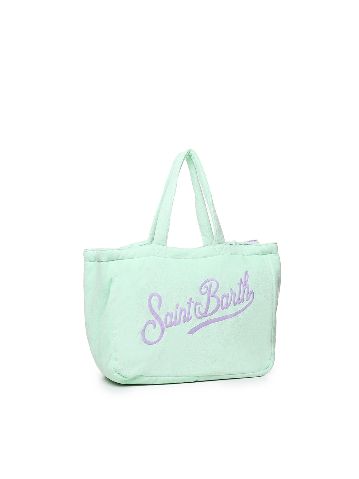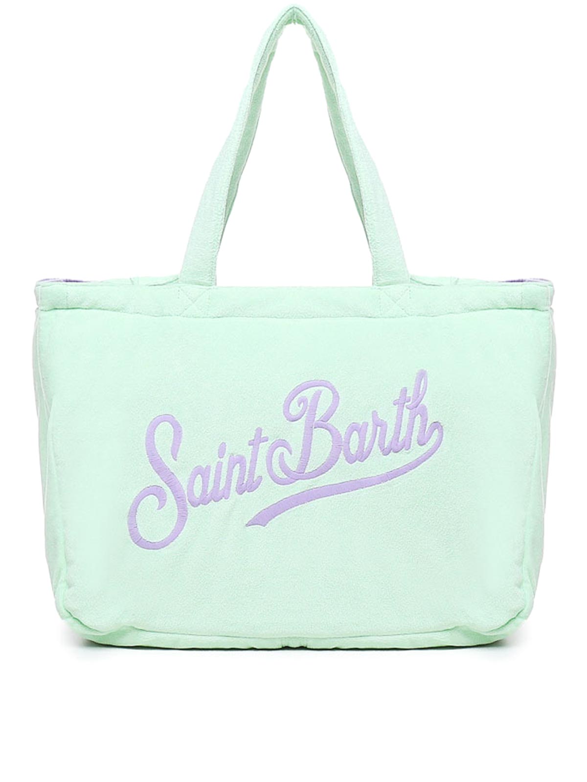 Double beach bag spacious interior doublesided sponge tote bag teal terry on one side exclusive saint barth logo lilac checked print on inside hidden pocket on the side drawstring