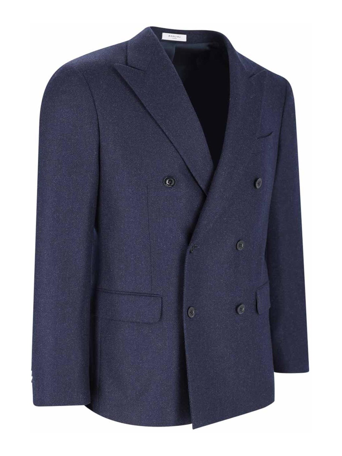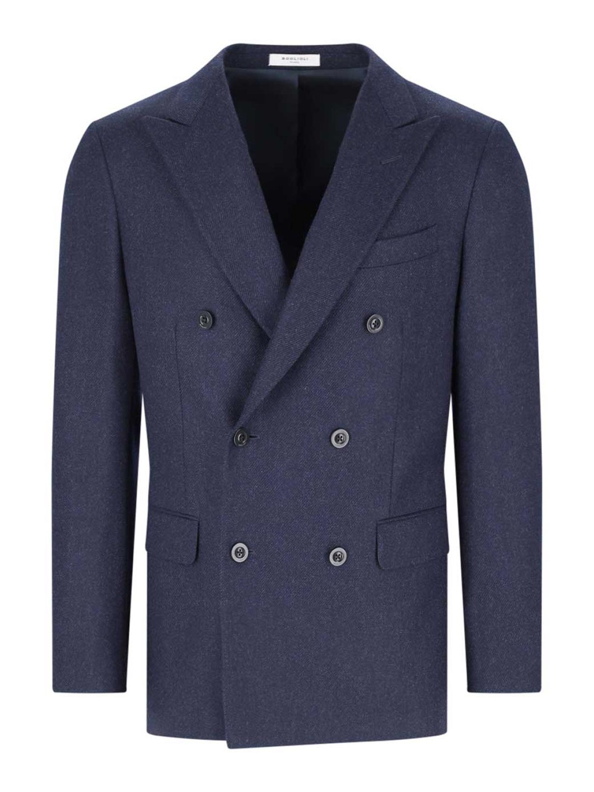 Boglioli double-breasted blazer in blue wool double-breasted design peak lapels chest pocket two flap pockets front buttons cuffs straight hem