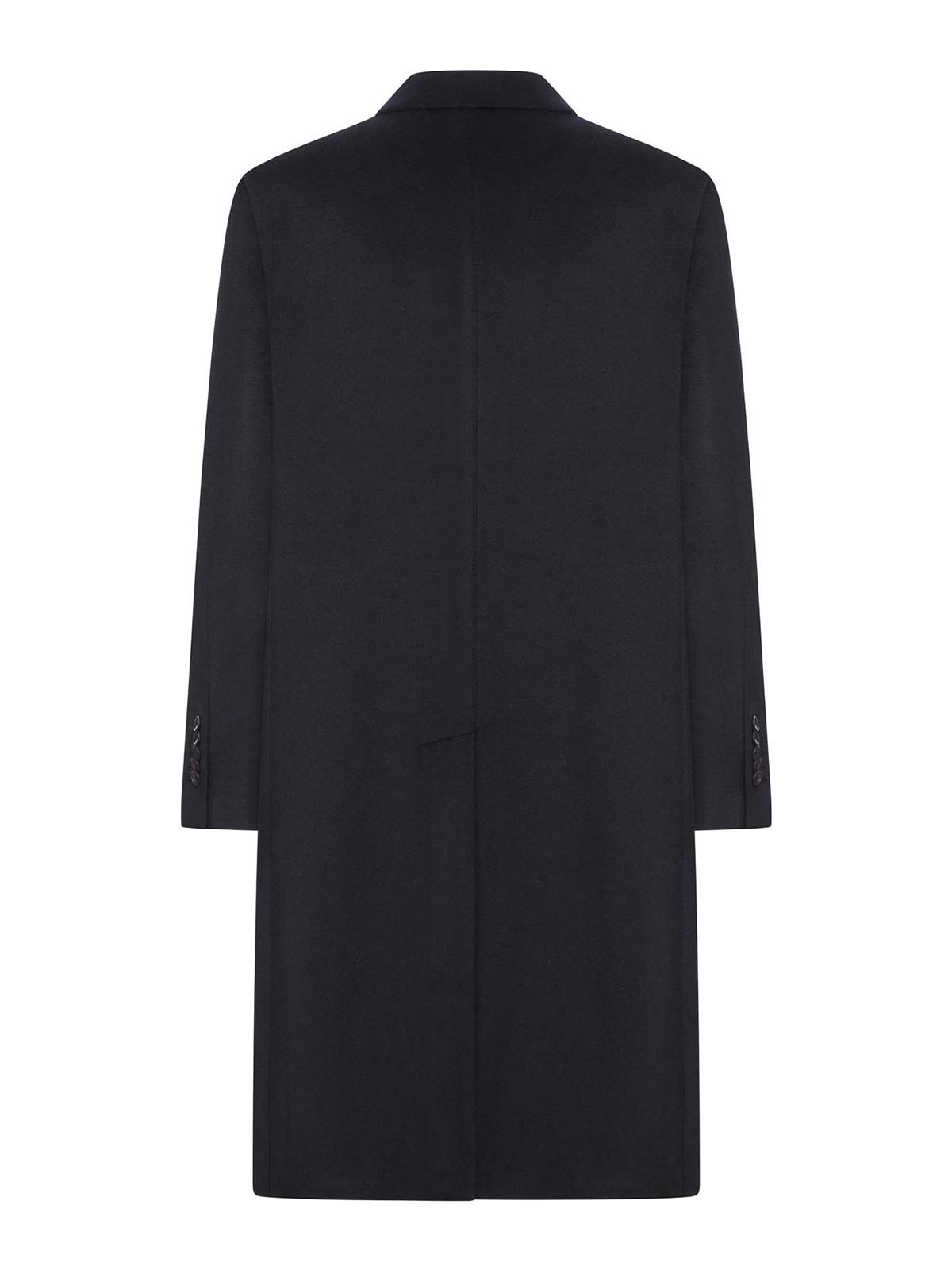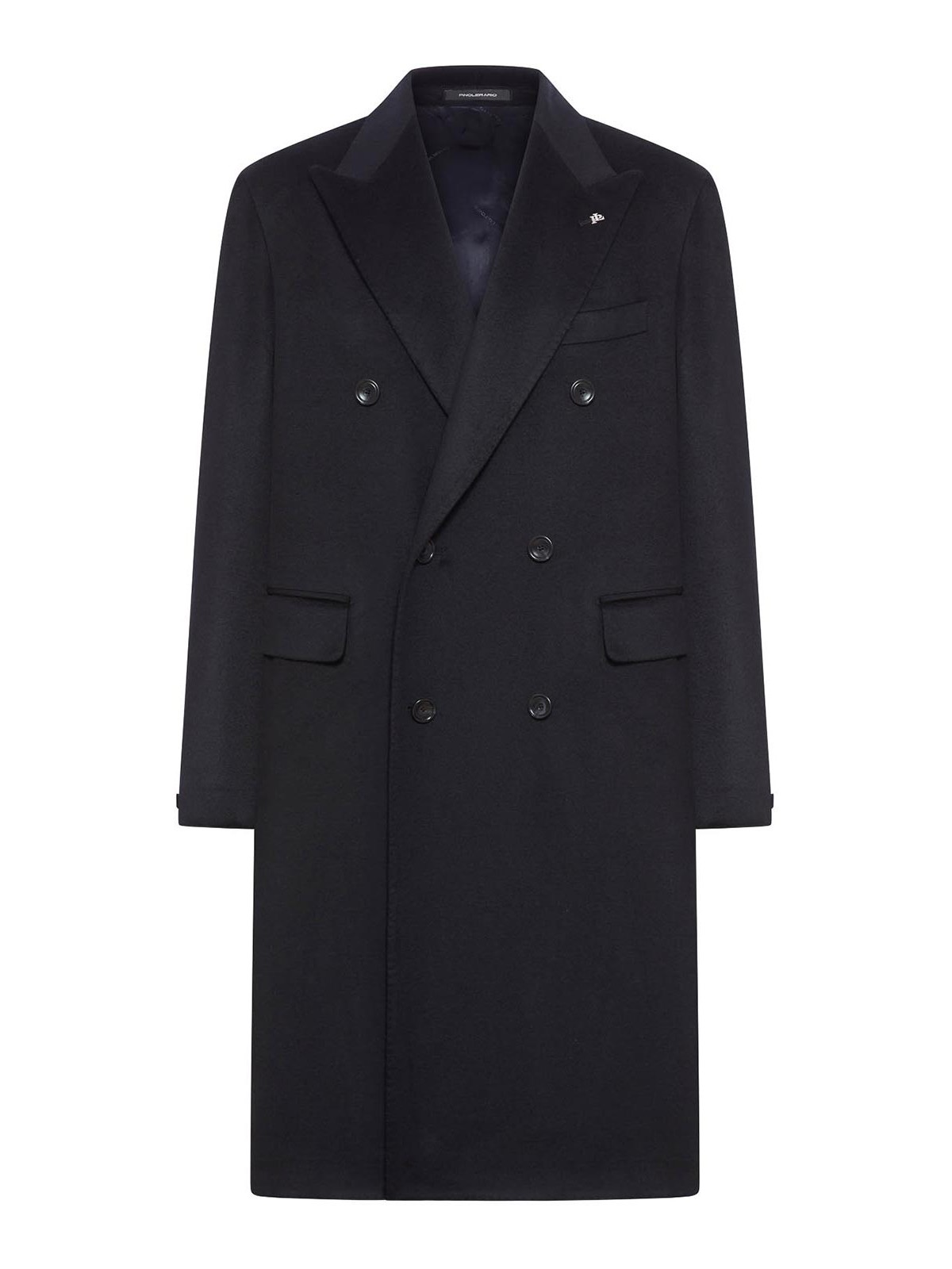 `pino lerario` double, breasted coat by tagliatore, navy blue, peak lapels, - tone logo, button, chest pocket, two side flap pockets, deep center back vent, buttoned cuffs, straight hem, color blue