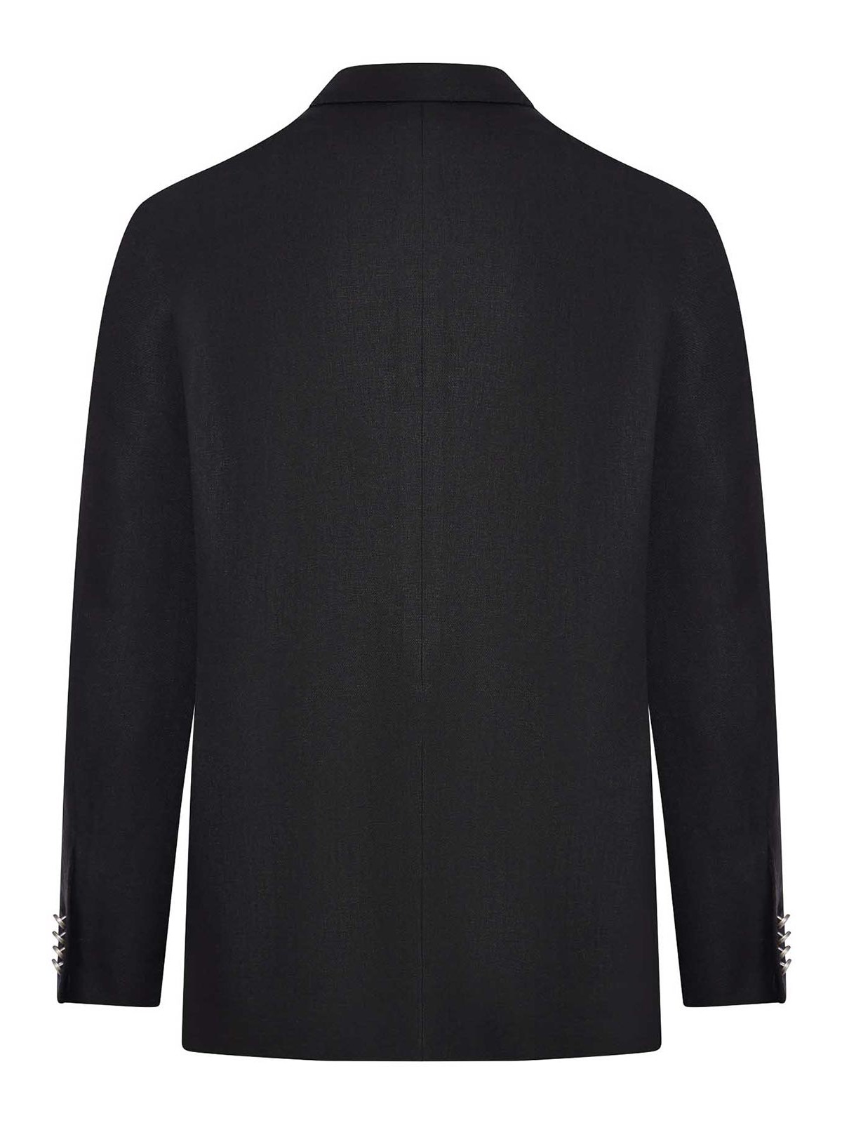 Double, breasted button, notch lapel, long sleeves, buttoned cuffs, pocket square, two flap pockets, - tone buttons, trousers with concealed hook, and, eye, mid, rise, two back welt pockets, two side welt pockets, color black
