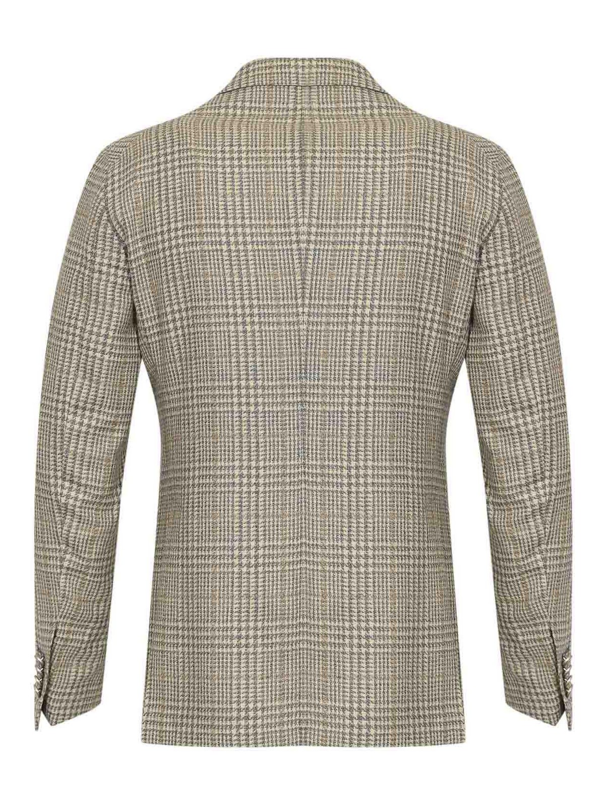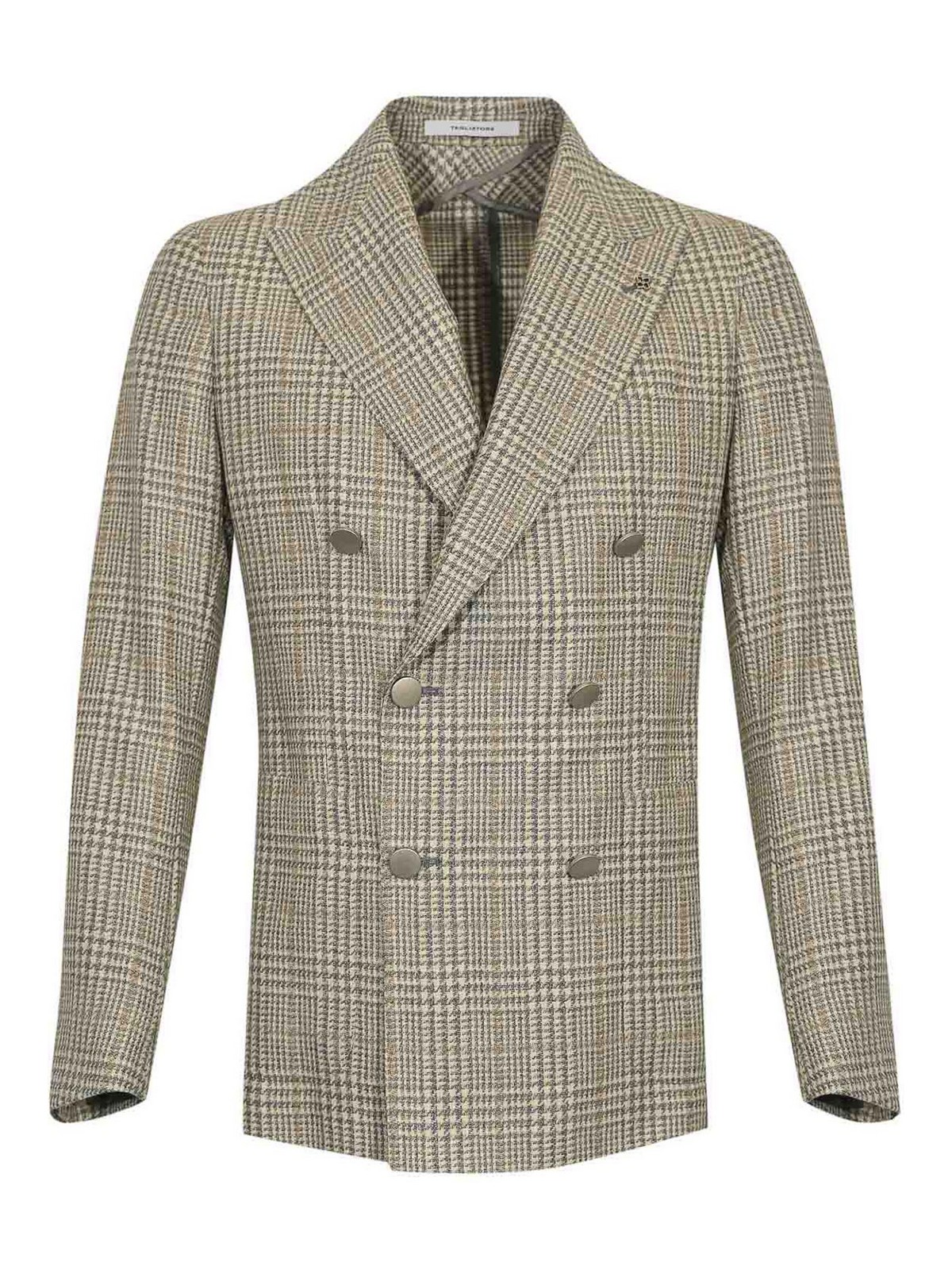 Double, breasted and blend jacket tagliatore model smc k and blend pattern prince of wales check in shades of beige and gray sleeves long with buttoned cuffs collar wide peak lapel double, breasted with six buttons on the pockets flap pockets and chest pocket elegant and structured fit soft shoulder tailored construction single back vent logo buttons lined partially lined fit slim fit