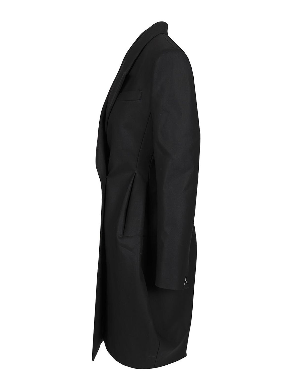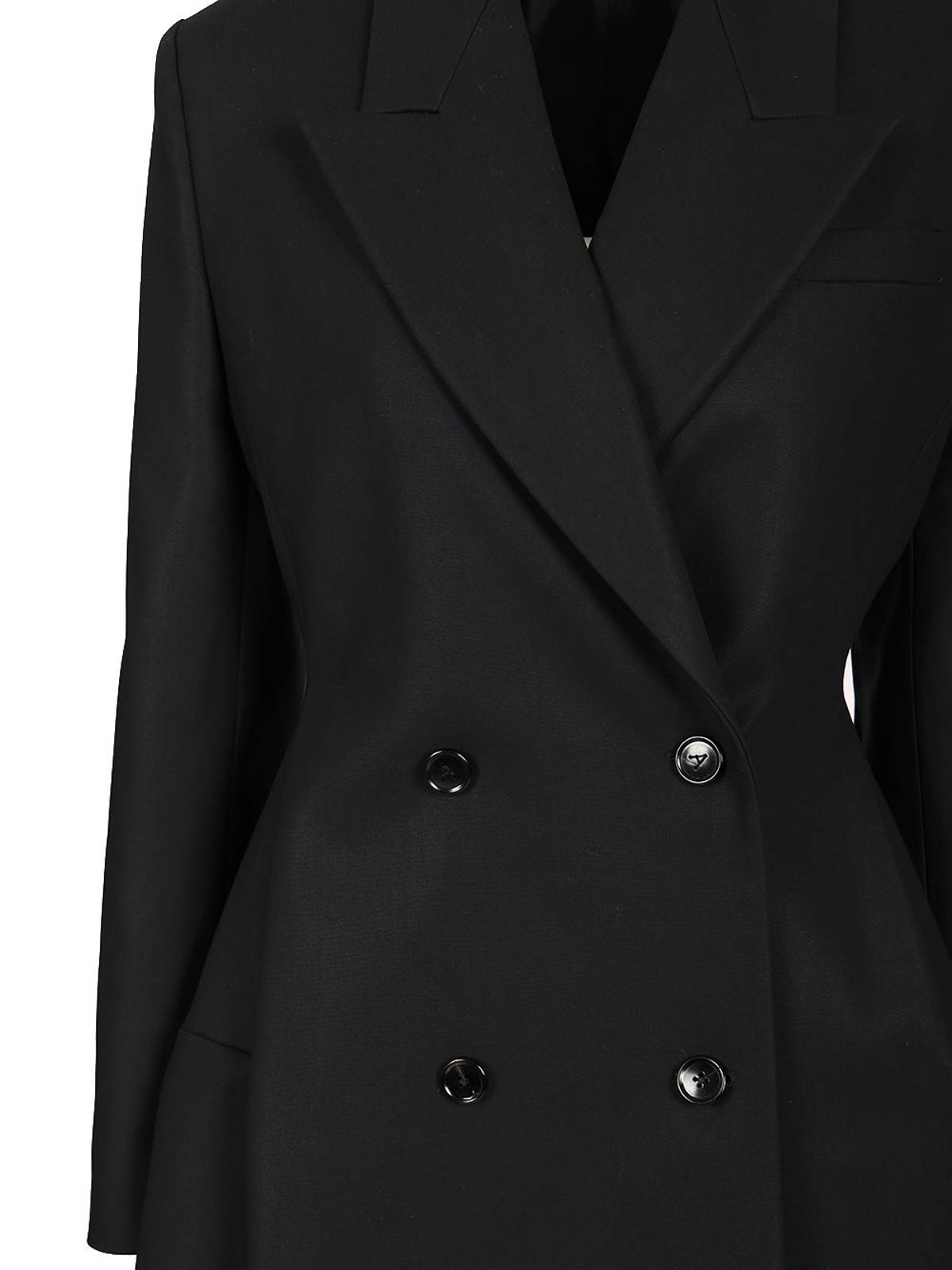 Alaia double-breasted rounded coat in double cotton, with peak lapels, long sleeves, square padded shoulders, a fitted waist, knee length, side pockets