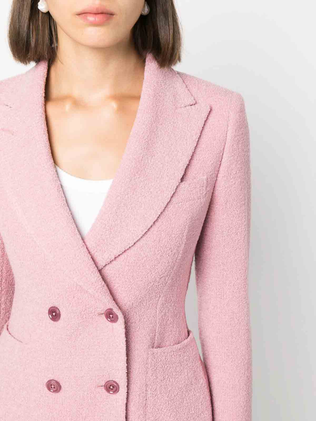 Coral double-breasted blazer from tagliatore featuring buttoned-cuff sleeves central rear vent double-breasted button two patch pockets rose pink classic lapels long sleeves and straight hem