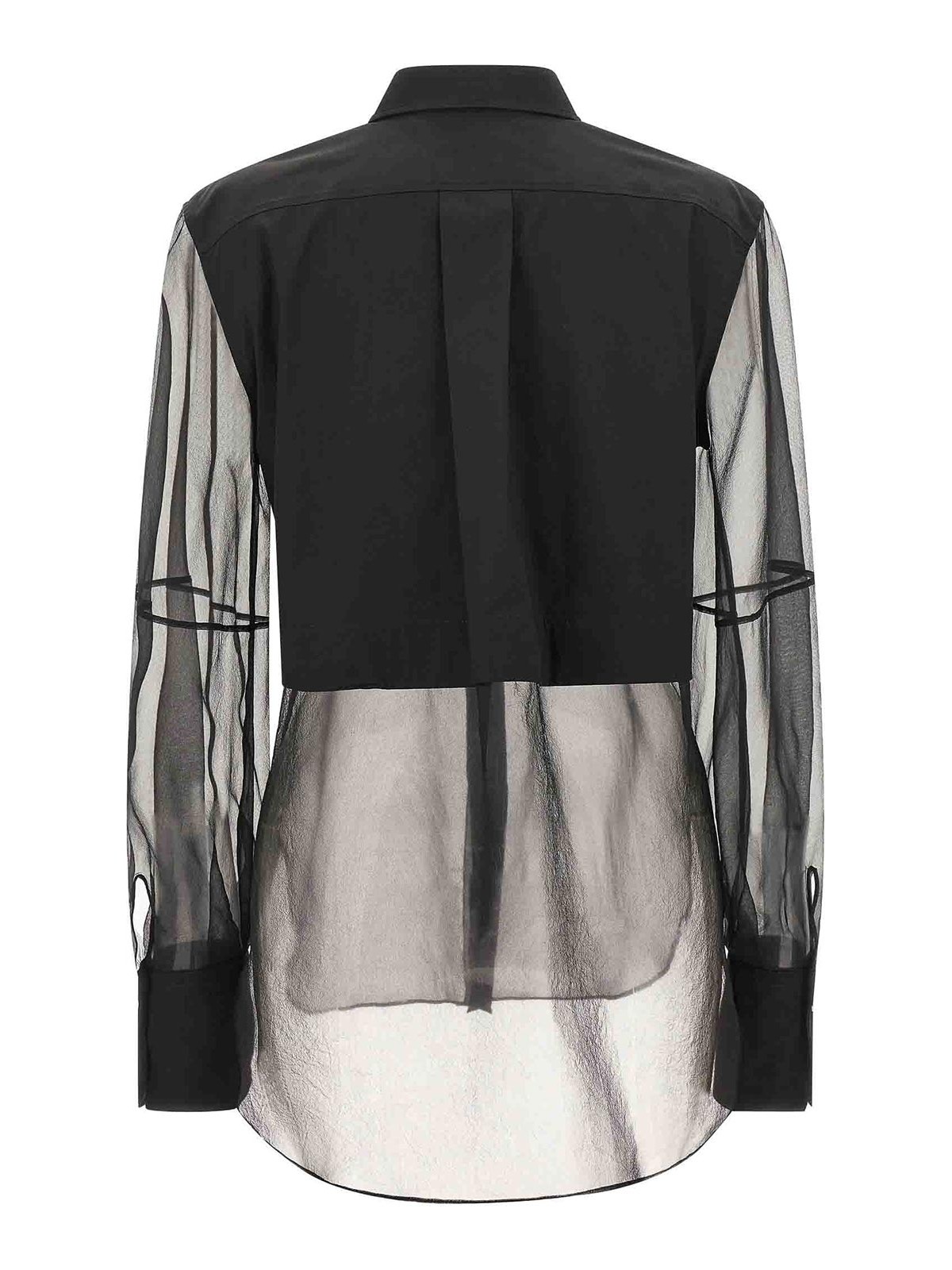 Double layer shirt consisting of cotton poplin top and semi-transparent organza sleeves and sleeves, monile detail and front button closure, long cuffed sleeves.