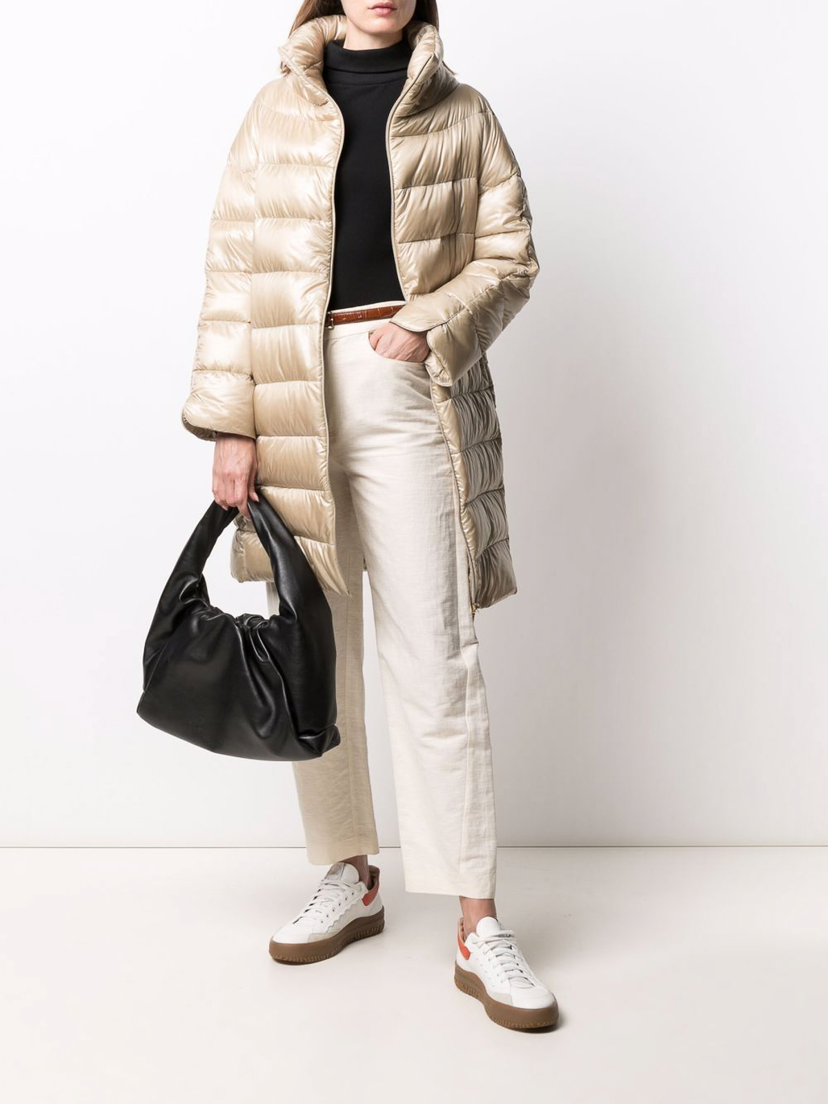 Light gold-tone down-feather mid-length coat from herno featuring down-feather filling front zip fastening long sleeves two side slit pockets and mid-length size it