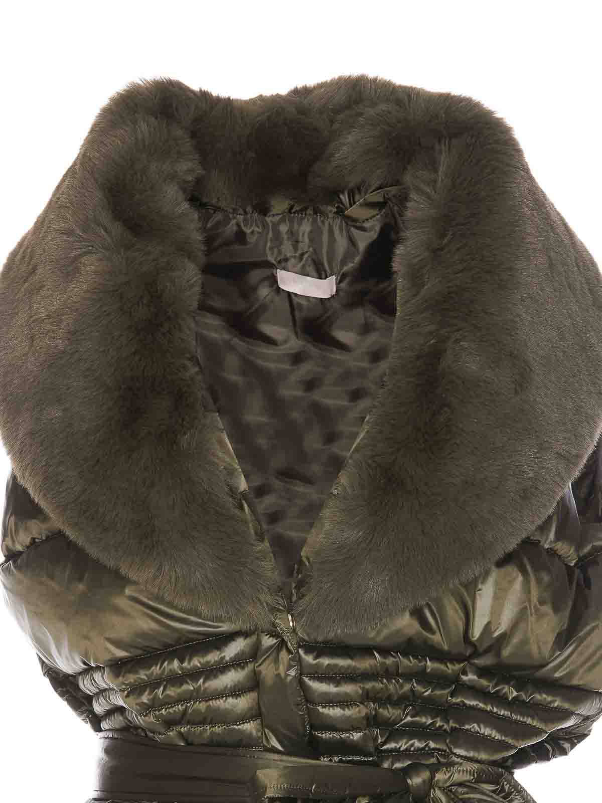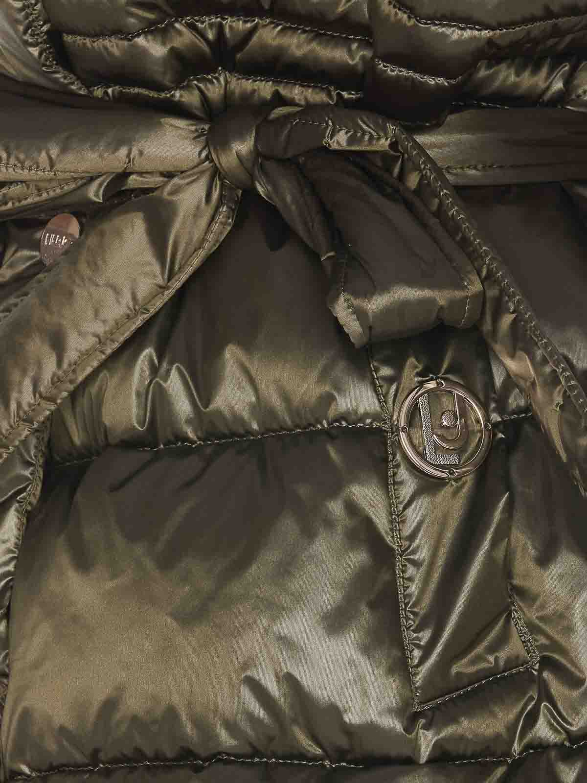 Liu jo green down jacket with frontal zip and buttons closure hood with faux detail pockets padded sleeveless belt detail