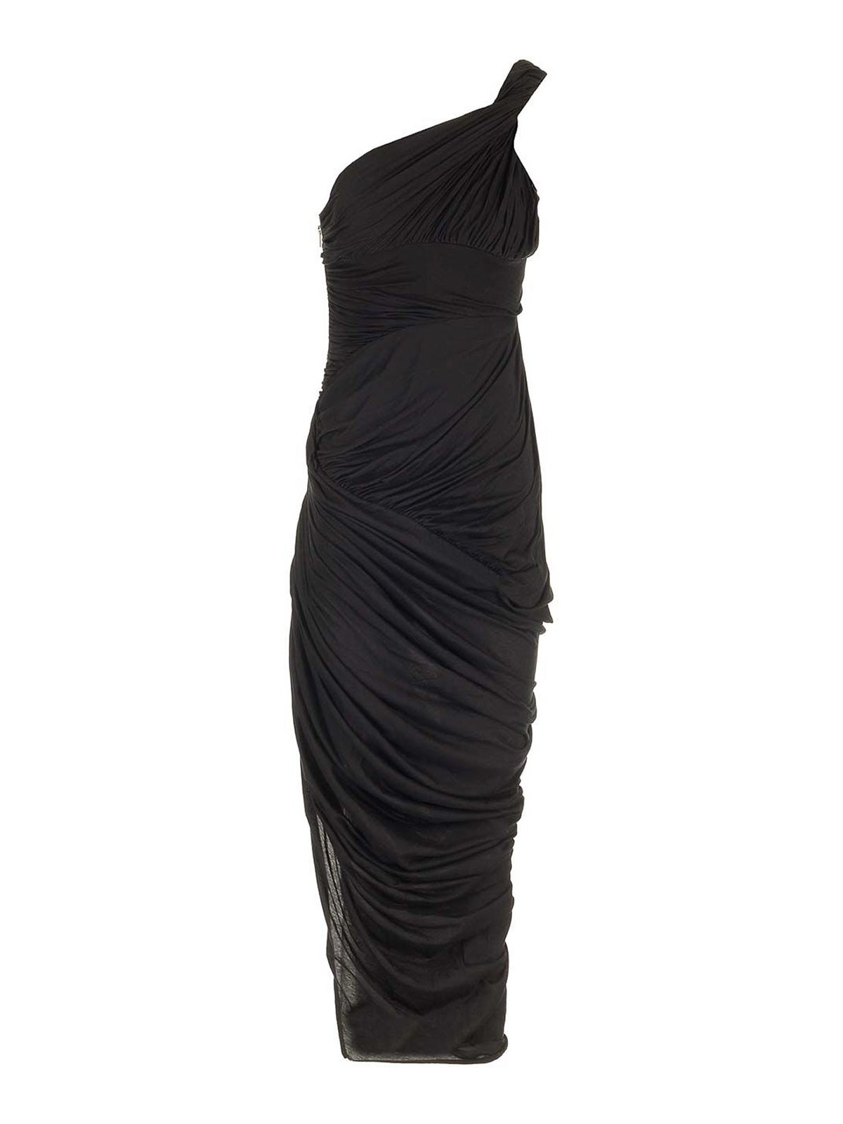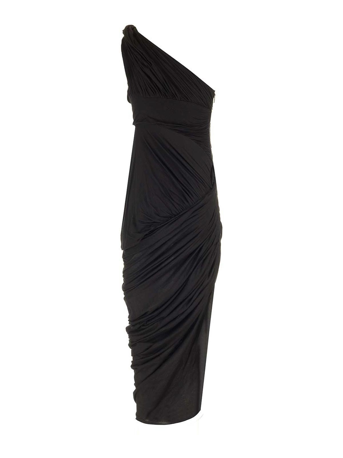 Draped black cotton jersey midi dress from rick owens, one shoulder, asymmetric hems, side zip closure and side slit.