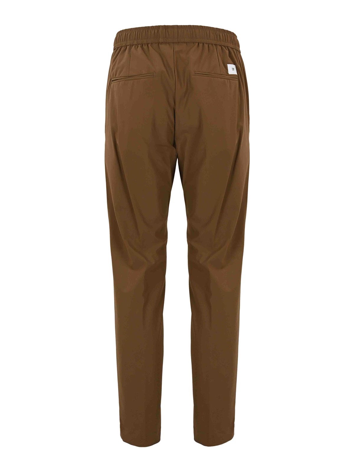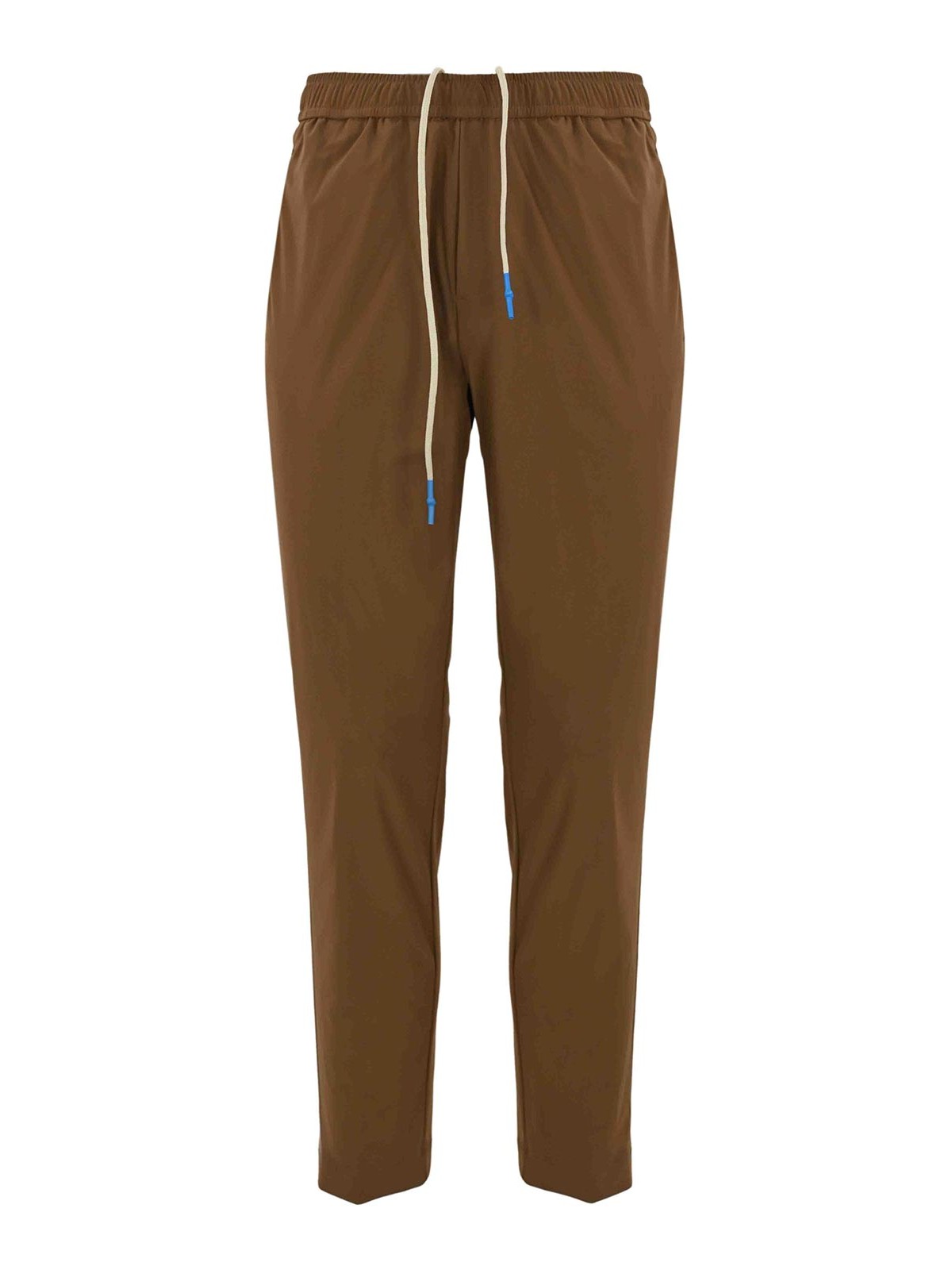 Mens drawstring trousers technical adjustable elastic waist with drawstring side pockets rear welt pockets logo patch on the back slim fit