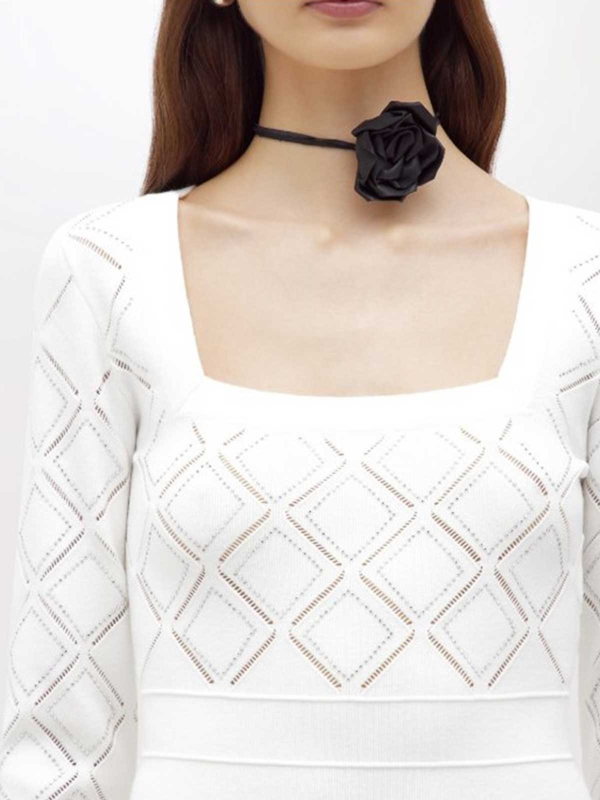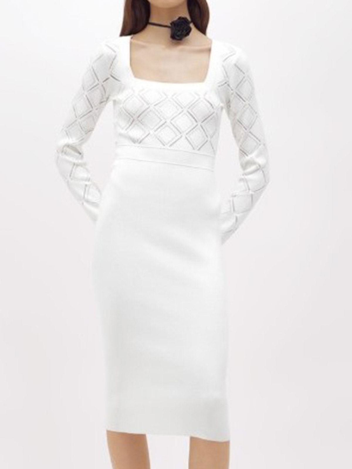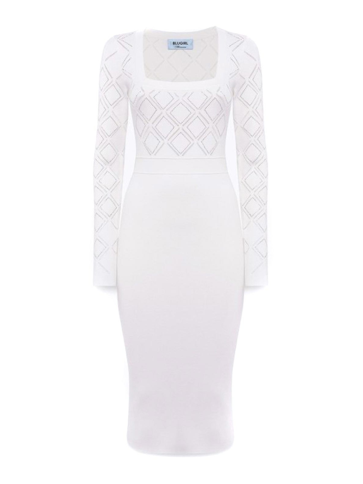 Blugirl fitted knit dress with rhinestones featuring a punched effect that creates a diamond pattern illuminated by heat-activated rhinestones, fitted waist, square neckline and midi length.