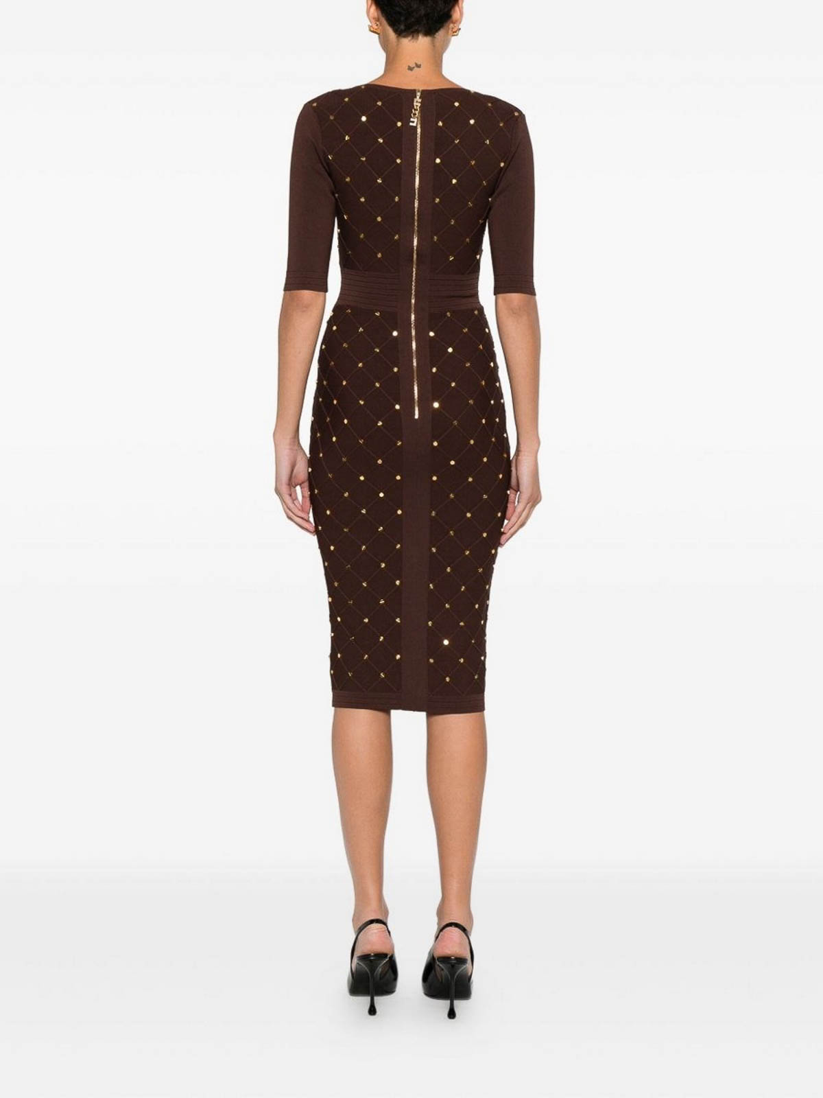 Elisabetta franchi knitted dress with jewelled details, v-neckline and above-elbow sleeves, diamond pattern with raised ribbing, embellished with gold metal buttons that add a touch of sparkle, zip with jewelled zip pull. slim fit.
