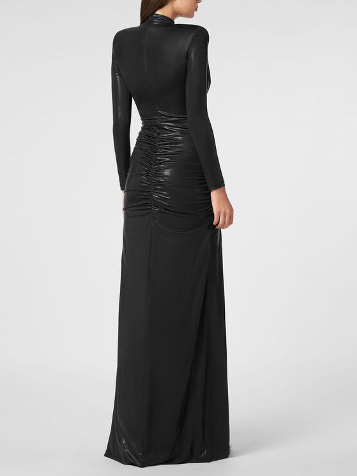 Enhance and illuminate your silhouette with this original long-sleeved evening dress made of shiny jersey.
