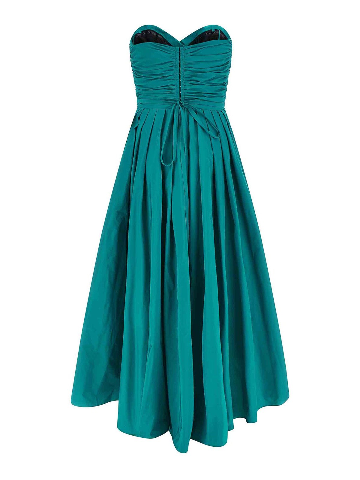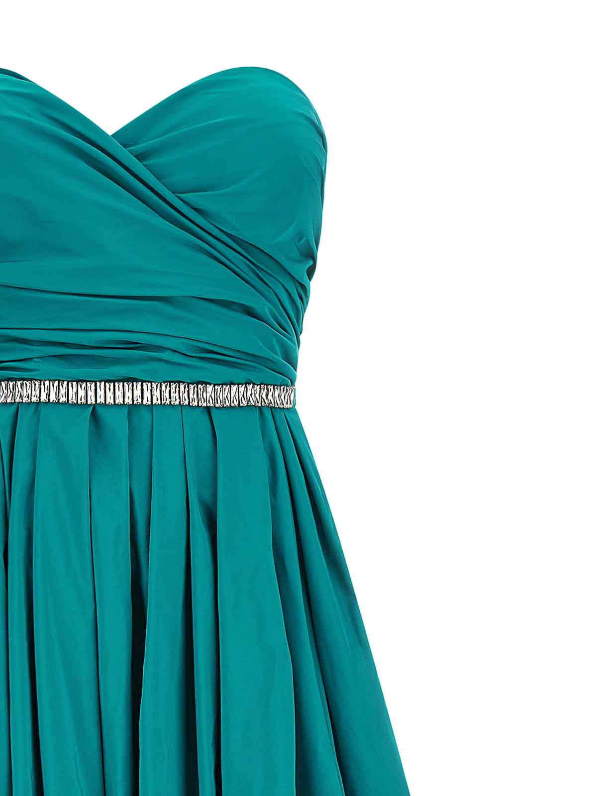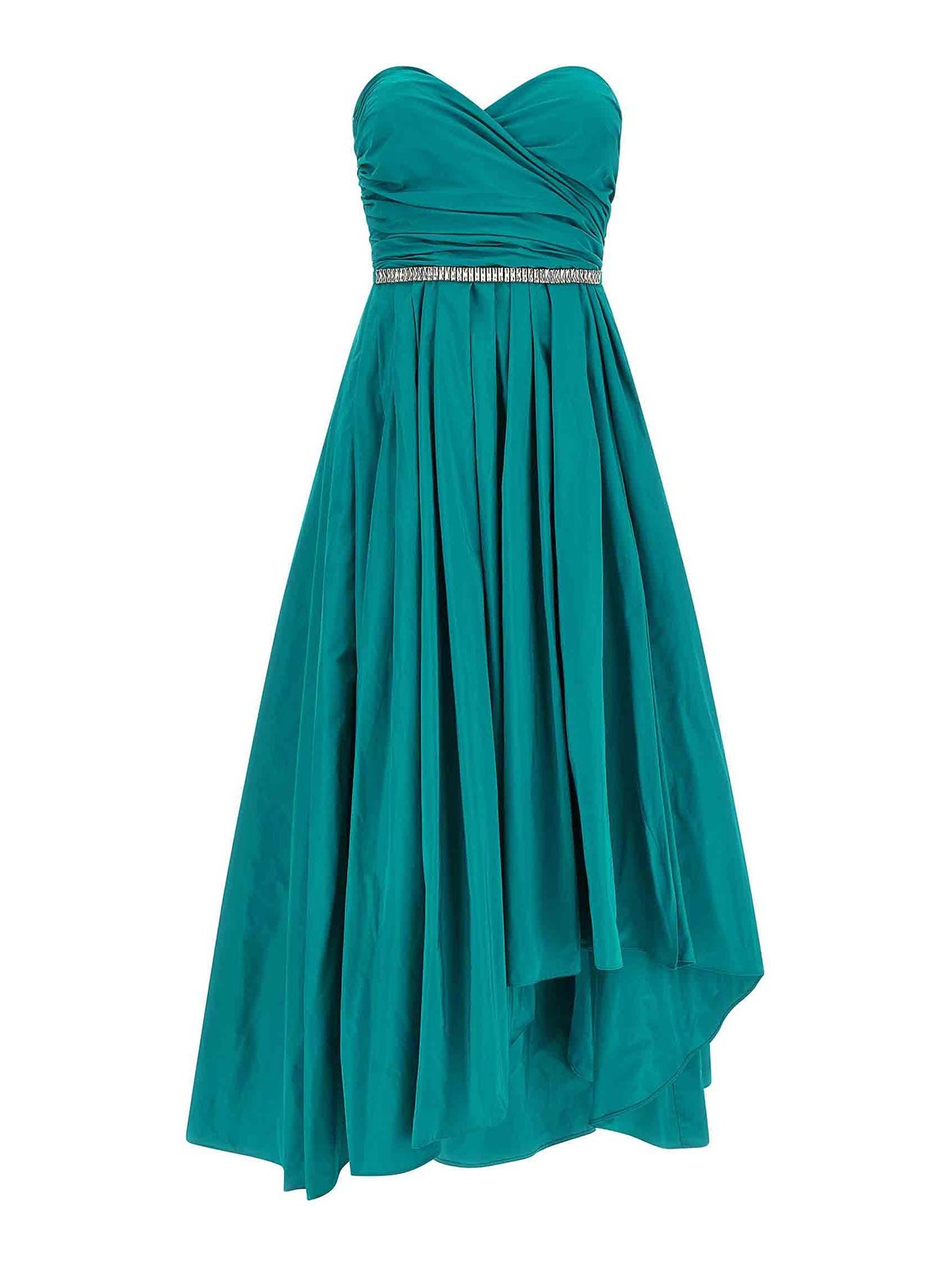 Long 'dattero' dress in light and shiny taffeta, off-the-shoulder model with tight bodice, sweetheart neckline with draping and side curls, sleeveless, voluminous and flared skirt with soft pleats, zip and hook closure on the back, side split, pockets, asymmetrical hem, unlined, removable belt combined with crystals.