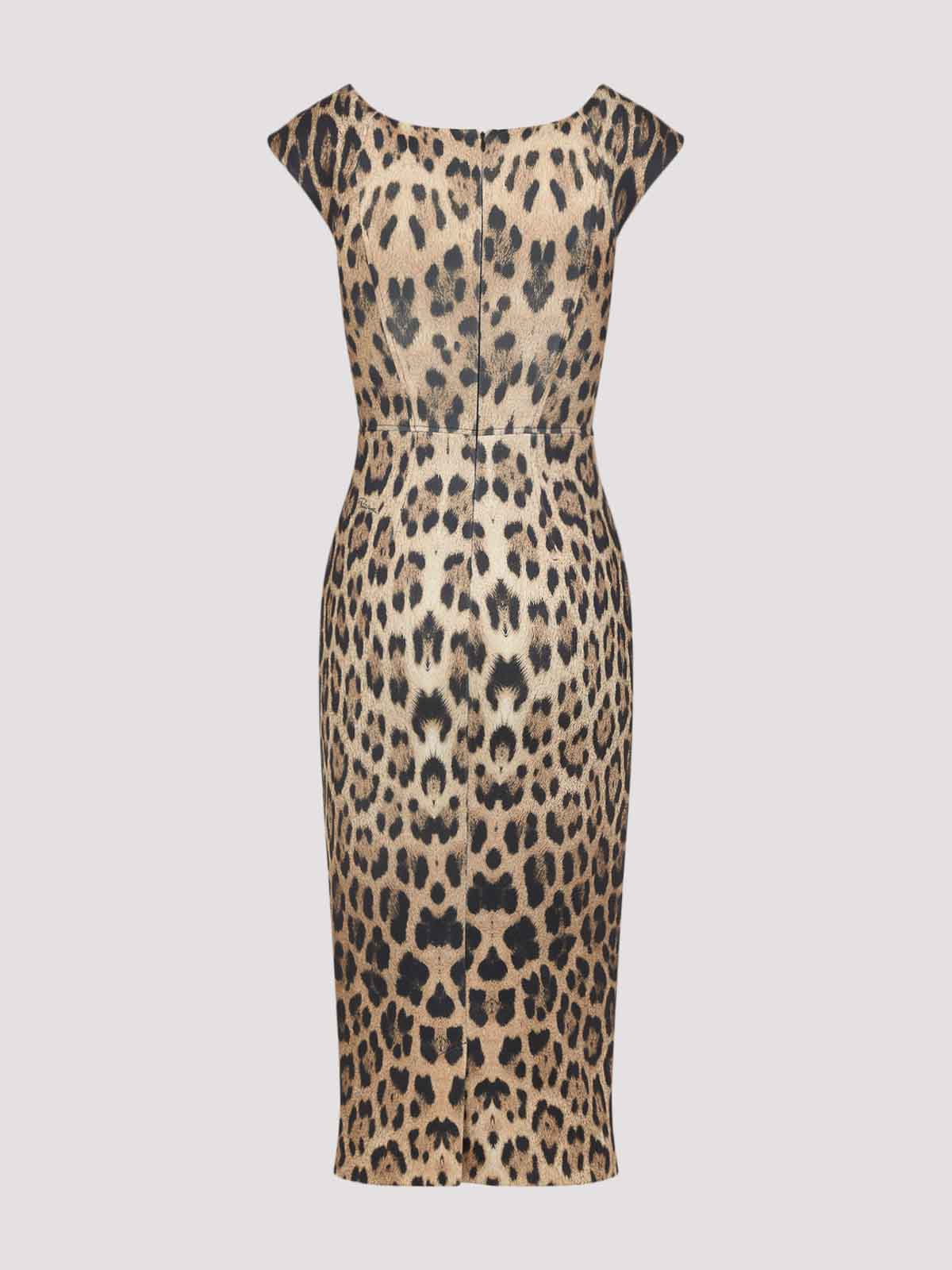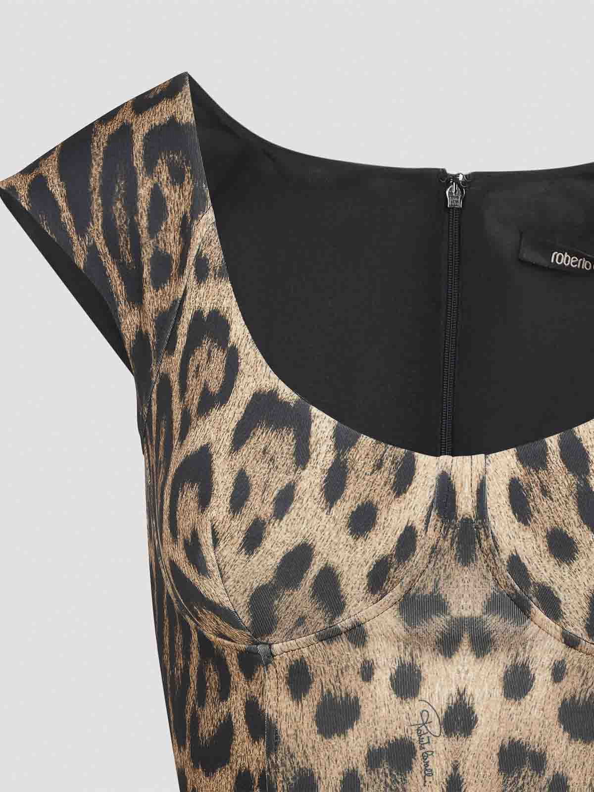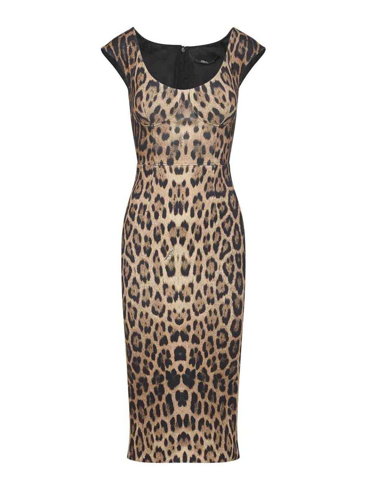 Roberto cavalli natural brown dress crafted and blend round neck back zipped short sleeves midi, length straight hem leopard design all, over fully black