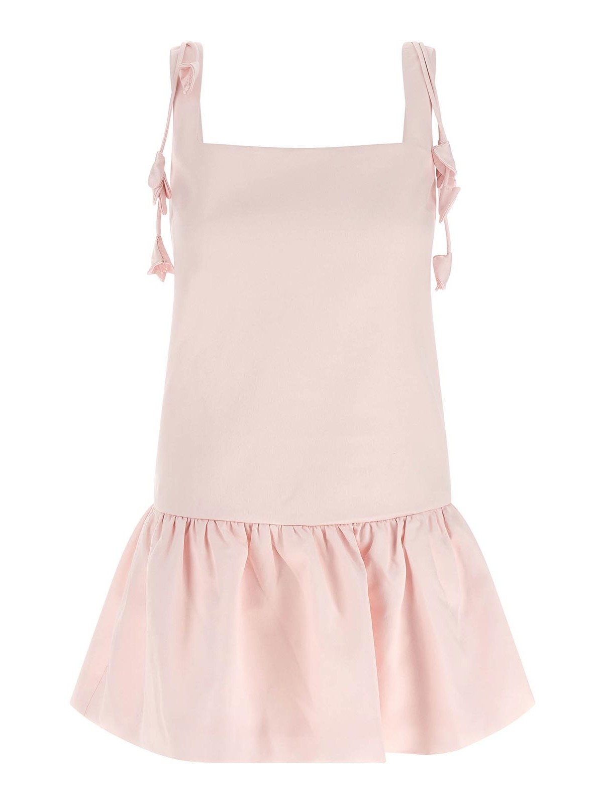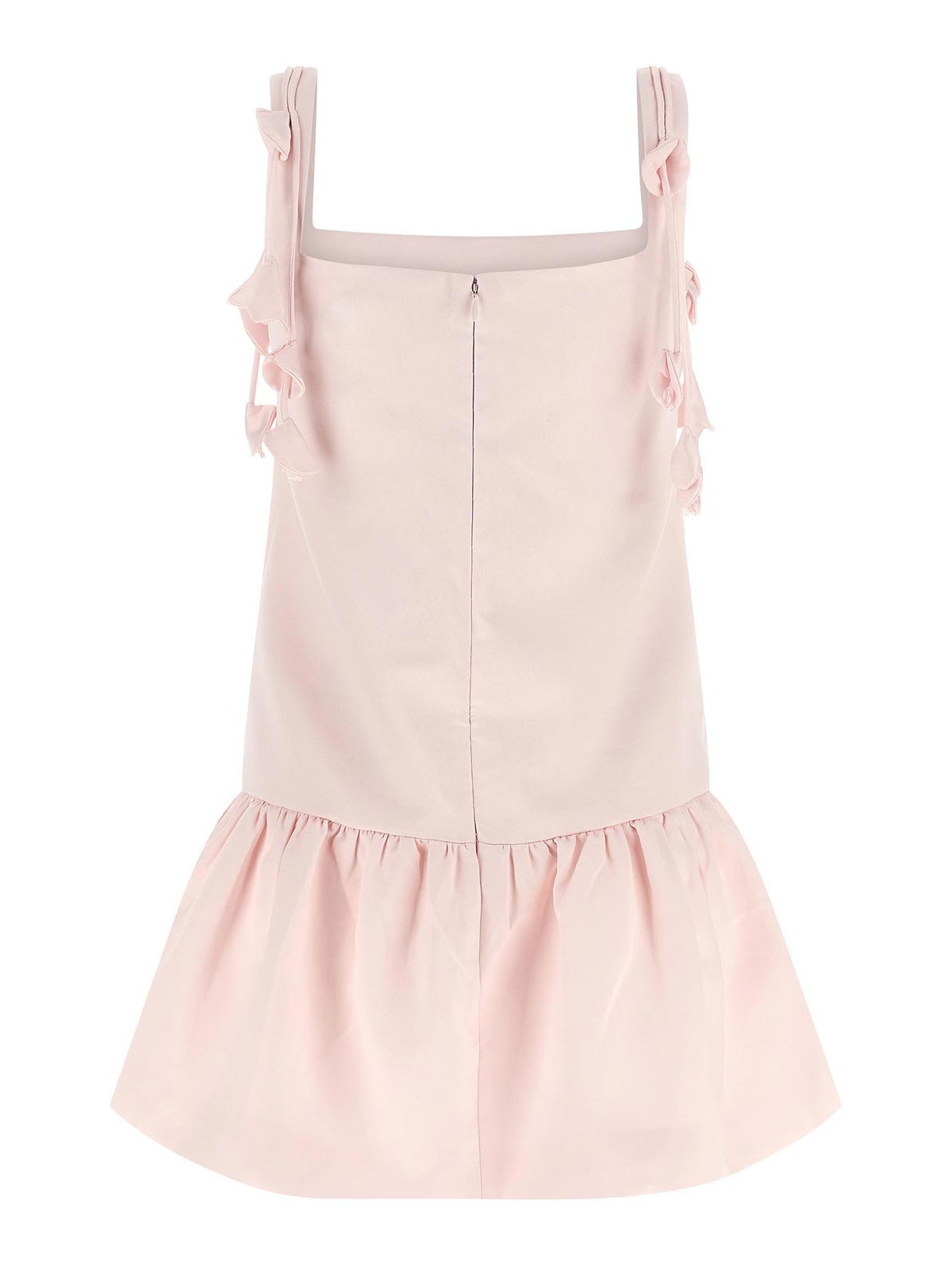 Taffeta mini 'pink flower taffet' dress, square neckline front and back, low waist, curled flounce on the hem, shoulder straps with hanging floral details, sleeveless, pockets, lining, back zip closure.