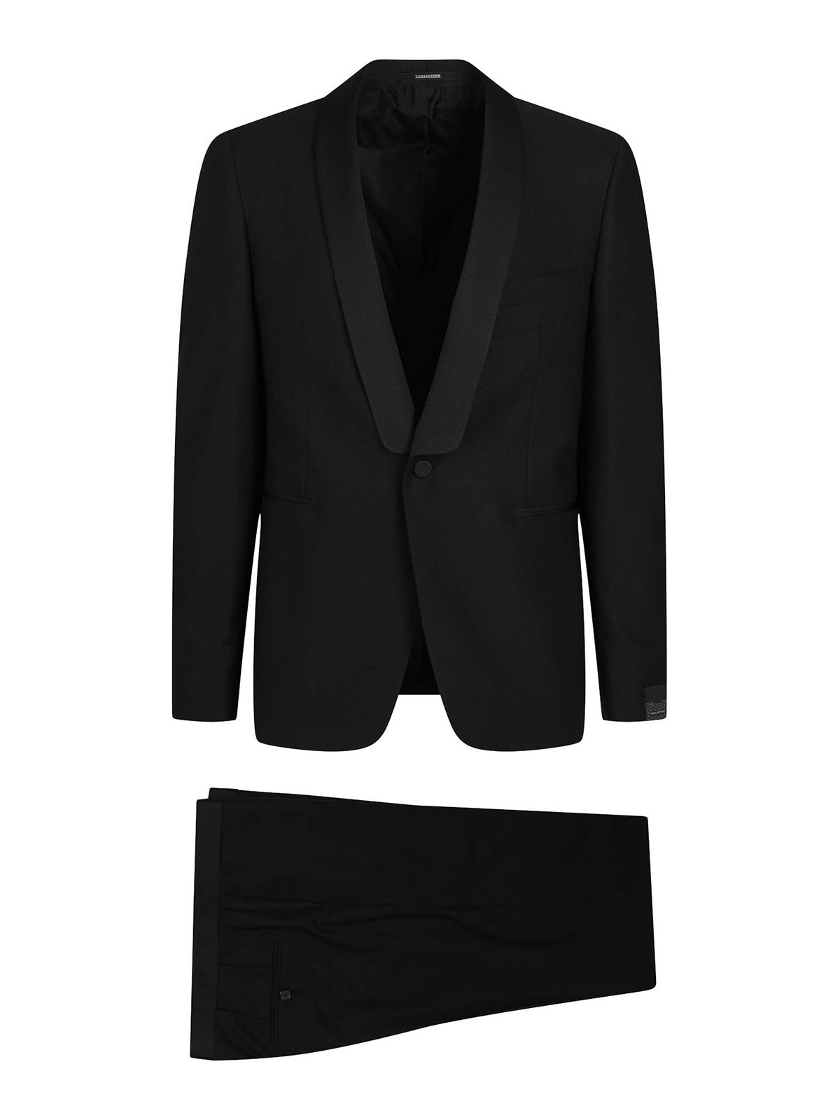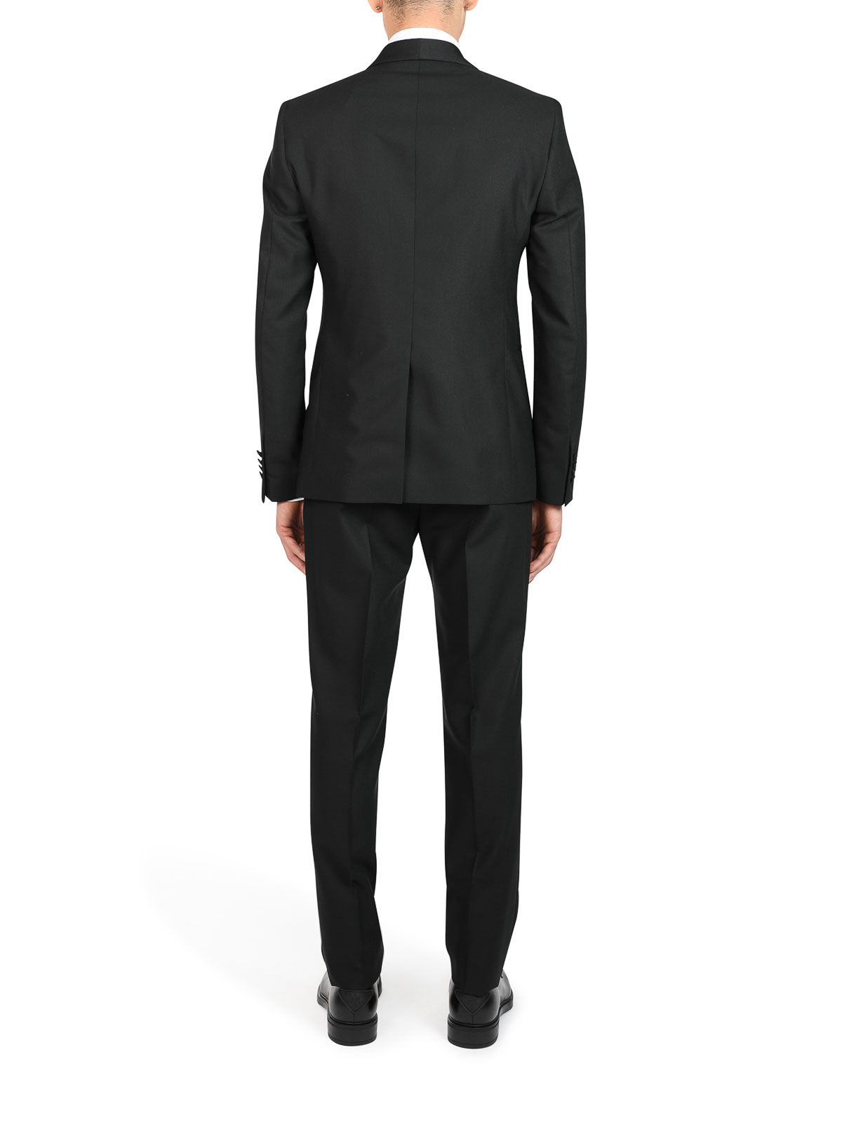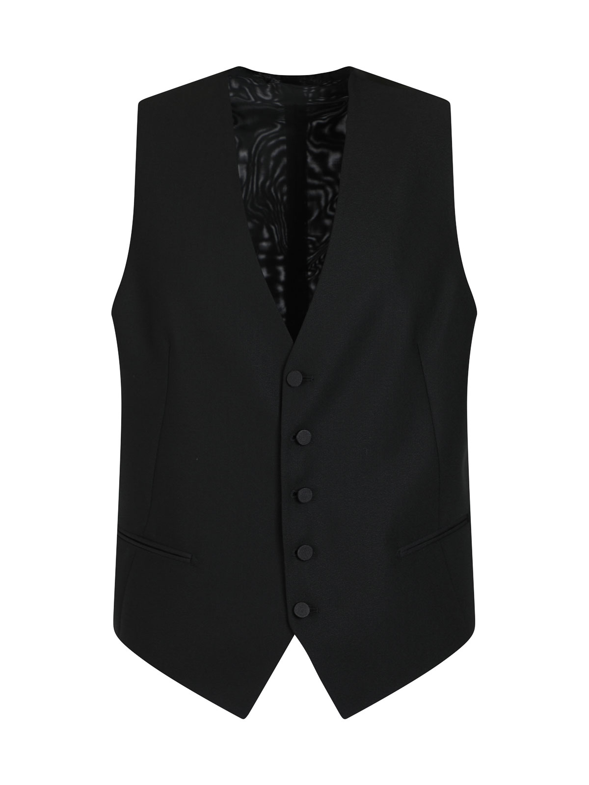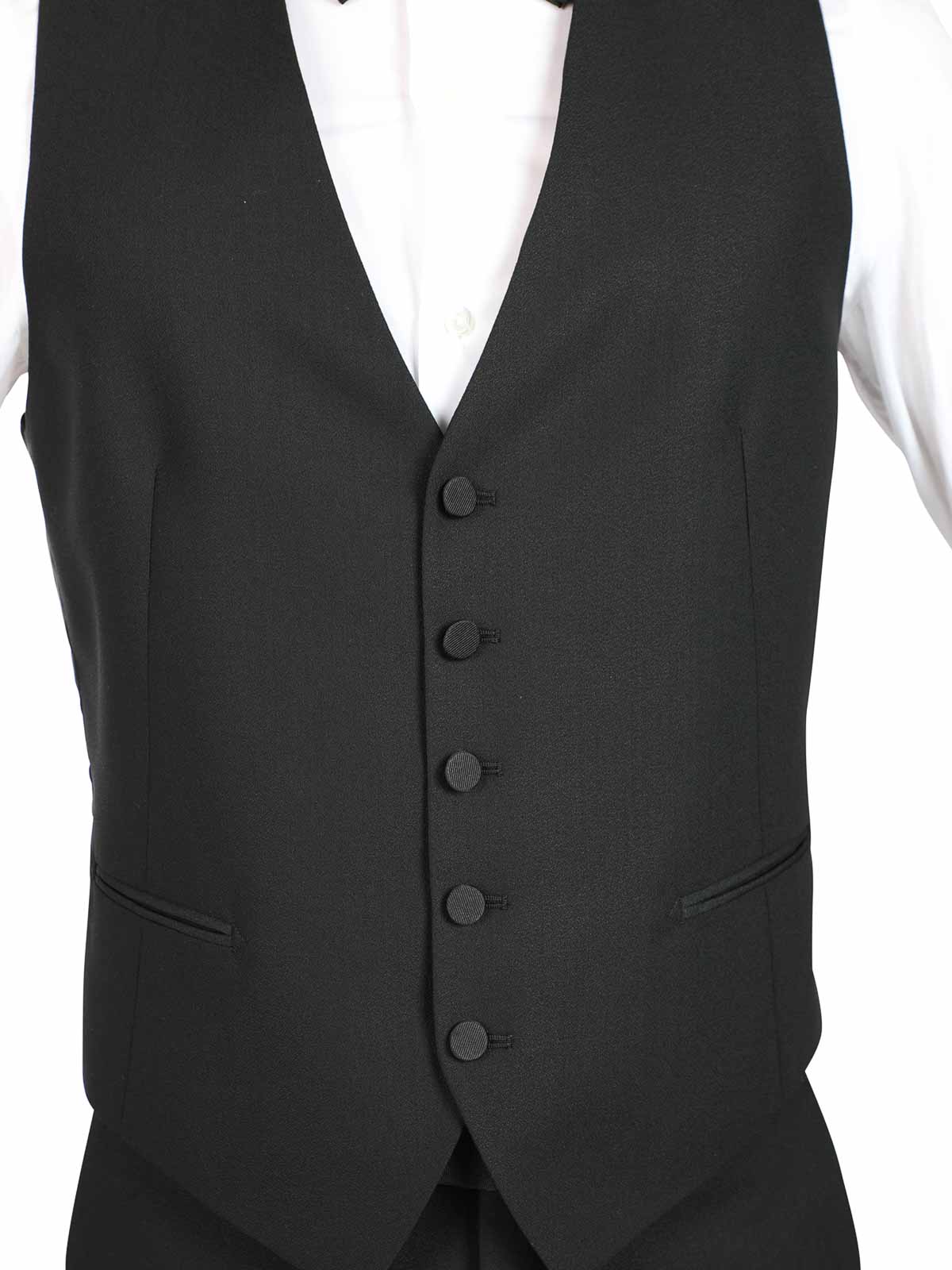 Tagliatore three-piece tuxedo- single-breasted jacket with two buttons- two side welt pockets- one chest welt pocket- the trousers have a waist pocket- zip and button, two side slant pockets- two back welt pockets with button, the vest has five covered buttons- side welt pockets- adjustable back- slim fit- color black
