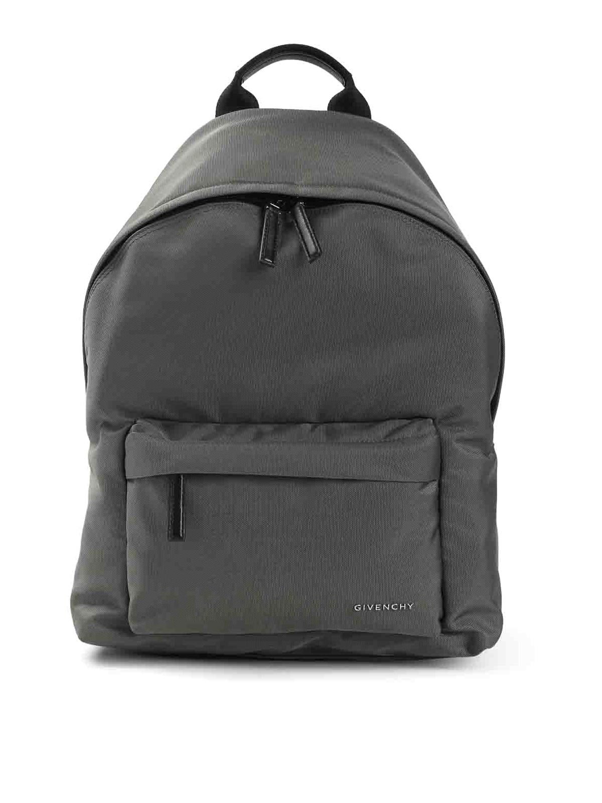 Givenchy essential u salvia polyamide backpack. crafted from salvia polyamide canvas, black leather details, front zip pocket with metal logo detail, two-way zip fastening, top leather handle, two adjustable padded shoulder straps on the back, one inner pocket.