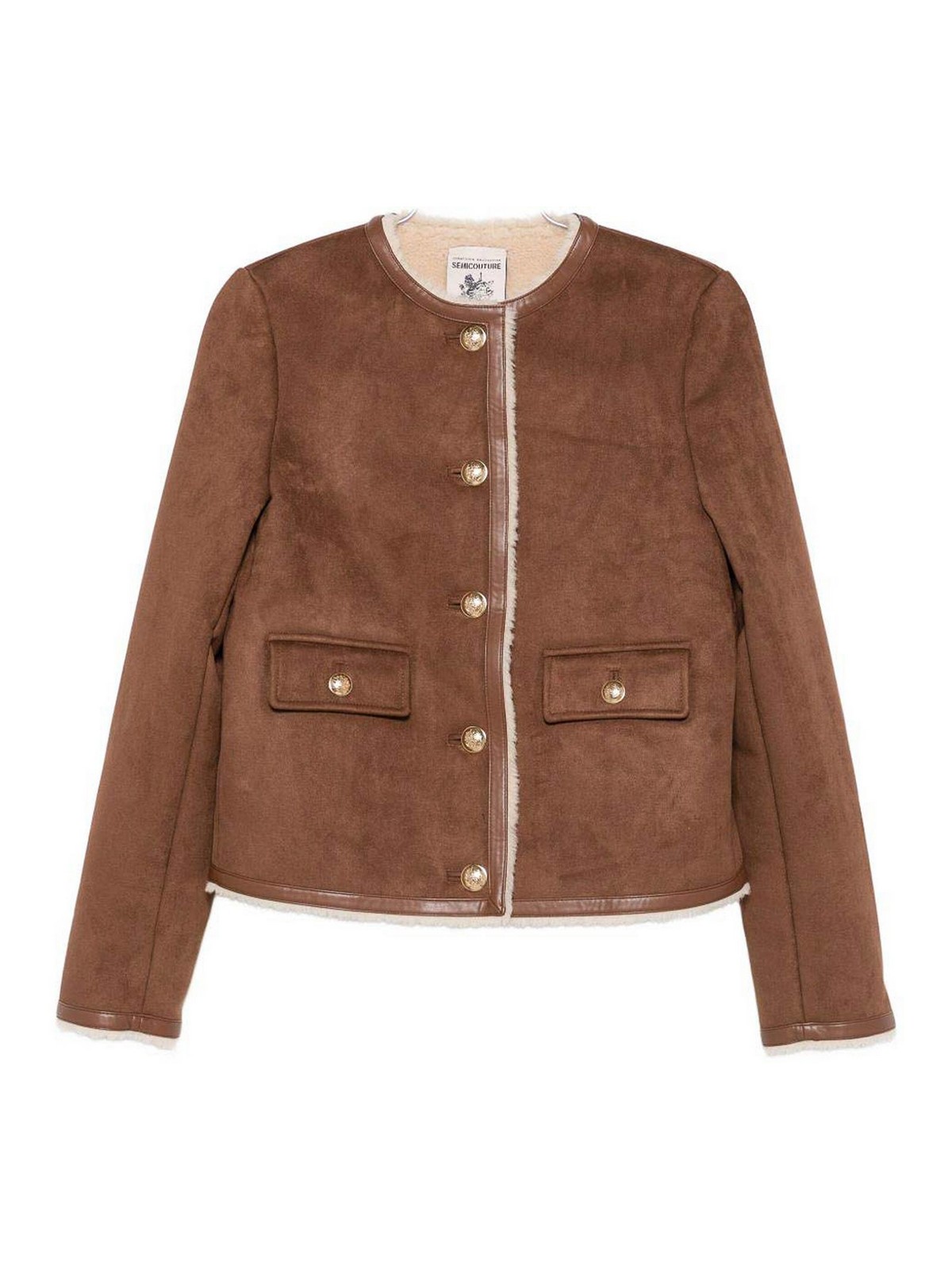 Brown round neck button two pockets, tone hardware faux trim