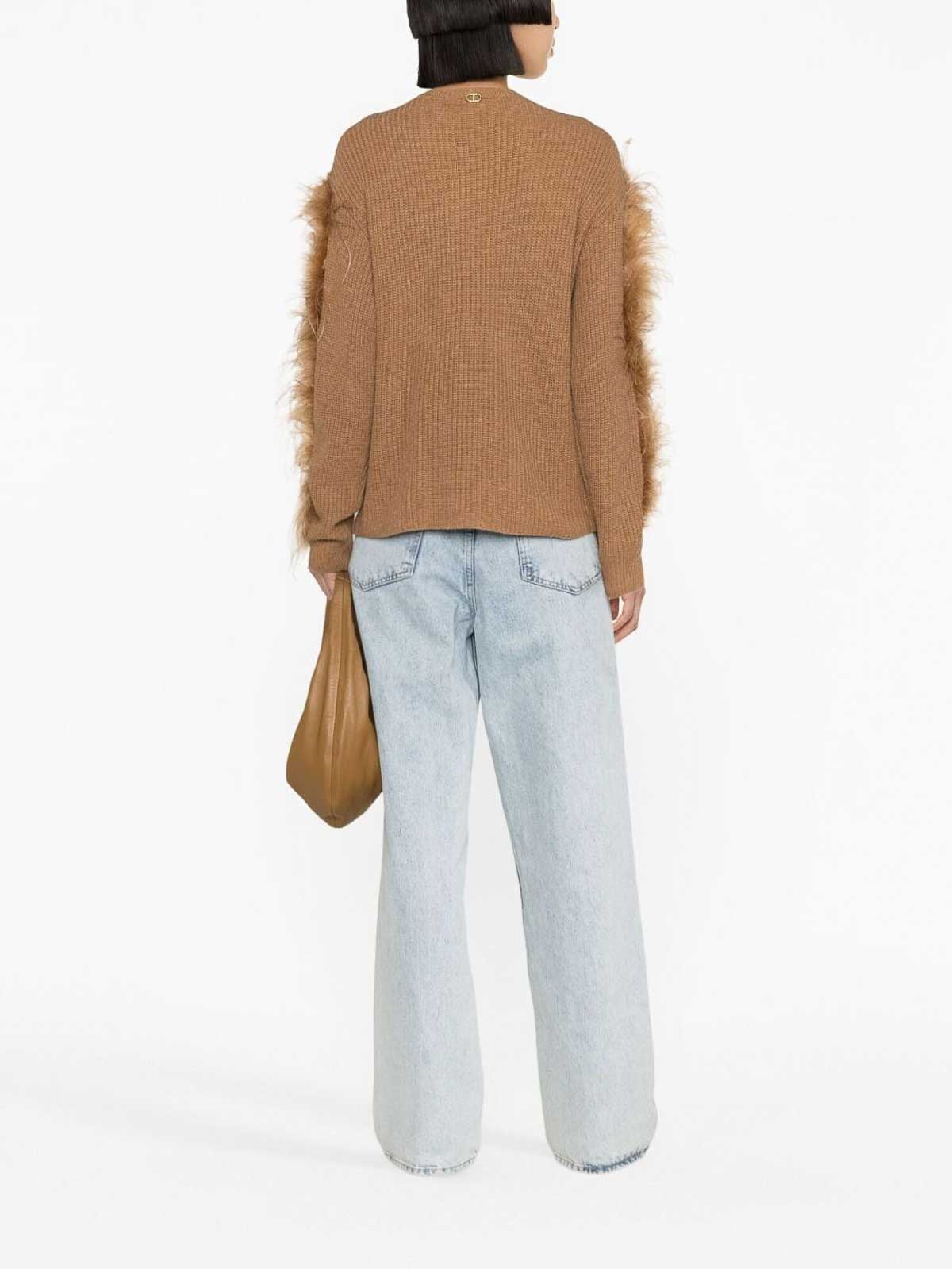 Feather-trim ribbed-knit jumper from twinset featuring brown blend knitted construction detailing logo plaque round neck long sleeves and straight hem