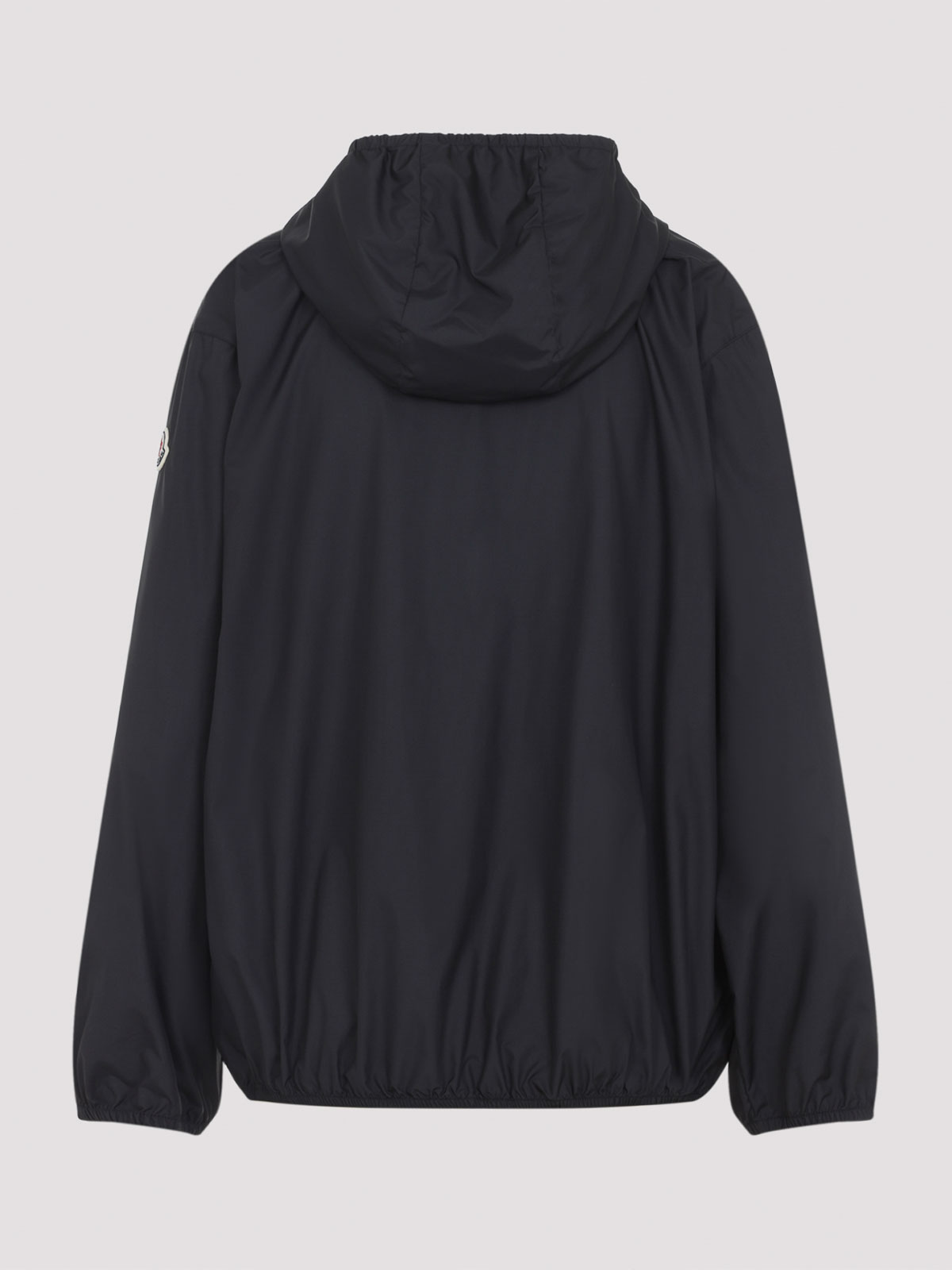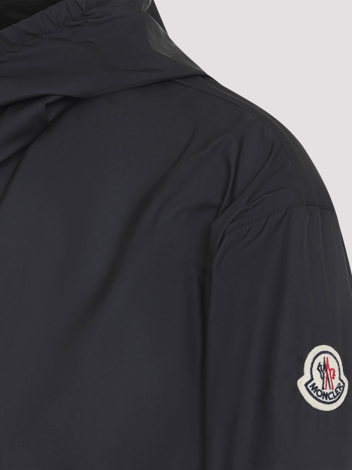 Moncler black fegeos jacket. pure black polyester jacket, tonal hood, stand-up collar, front zipped fastening, side pockets, long sleeves, patch logo on the right sleeve, elastic cuffs and hem, straight hem.
