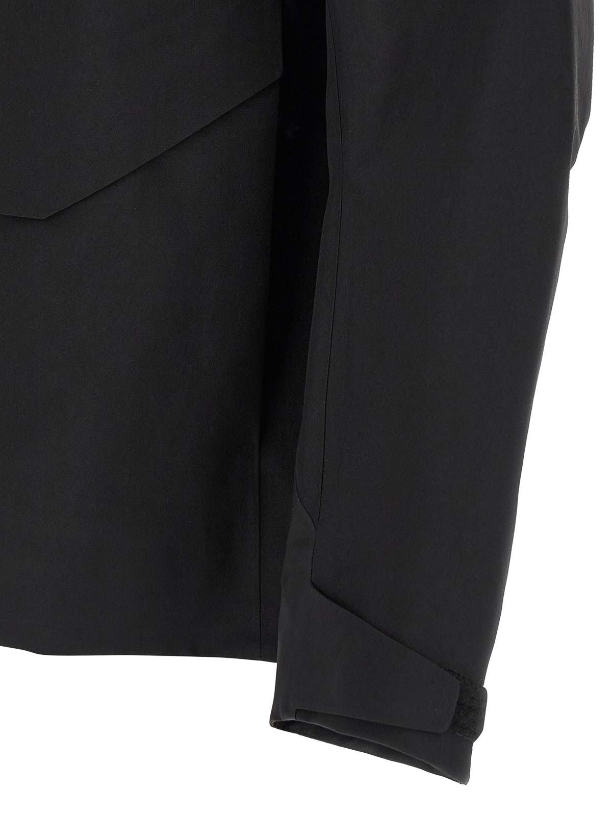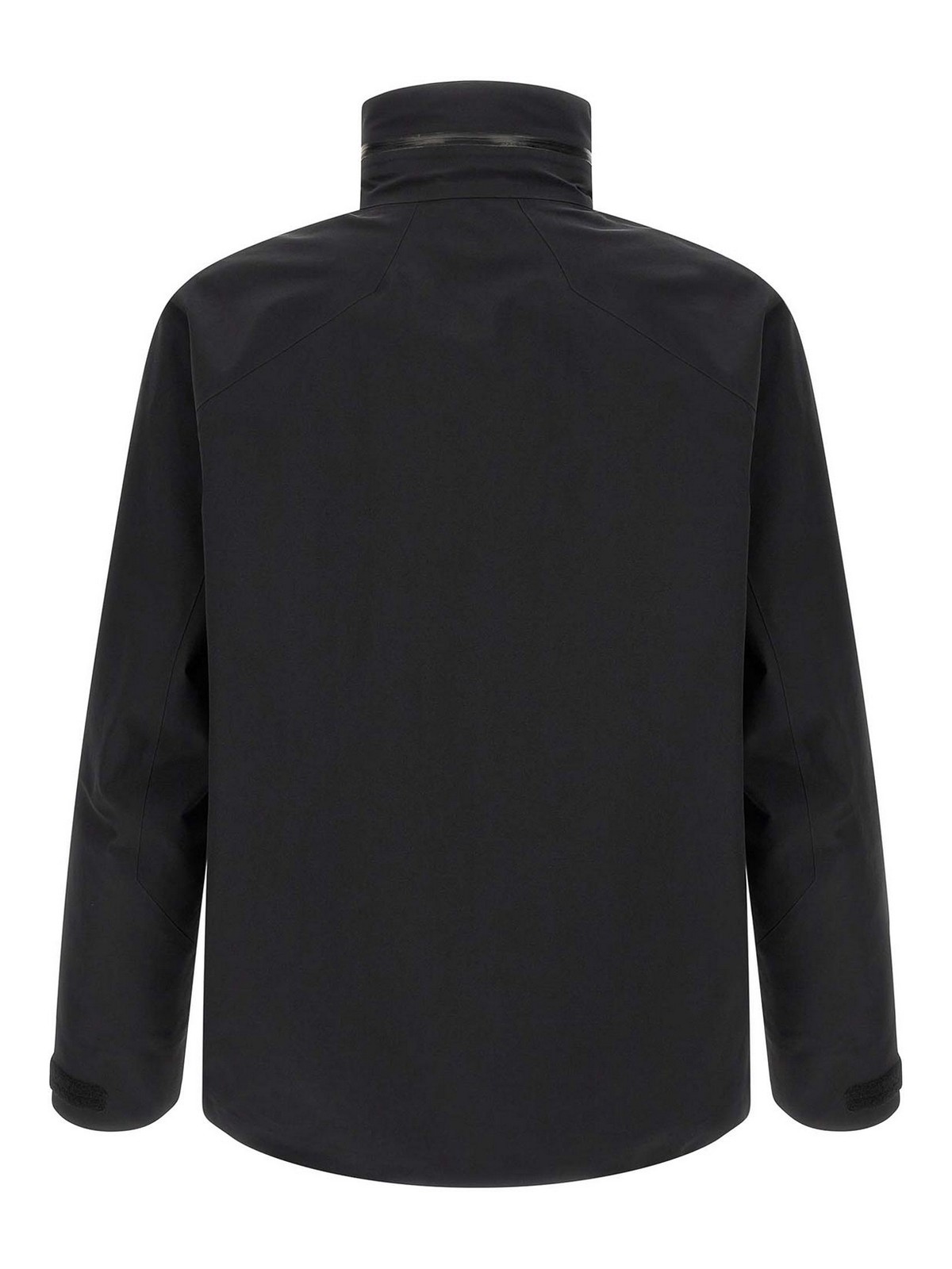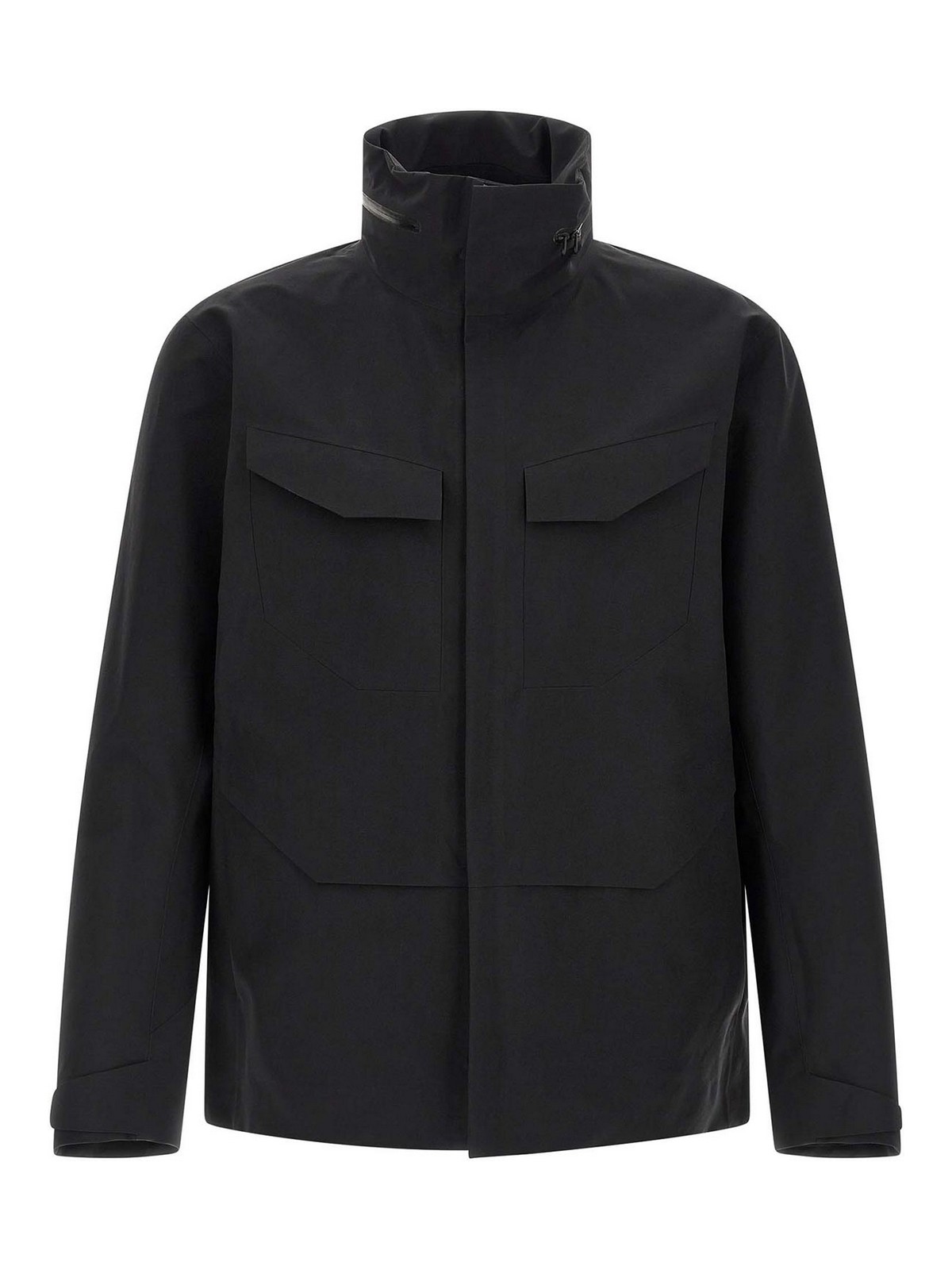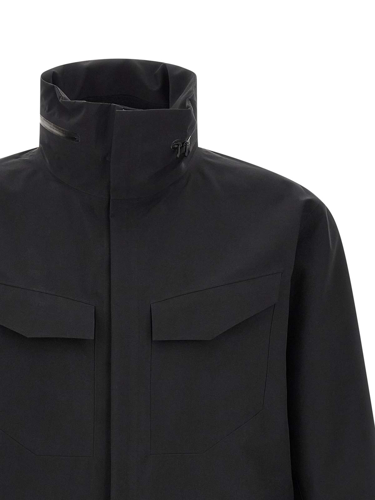 field' water-repellent and breathable gore-tex pro epe jacket, standing collar with adjustable 'stowhood' removable hood, concealed front zip closure, pockets, long sleeves with adjustable cuffs, unlined.