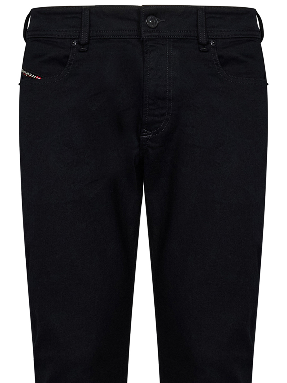 Covered zip fly closure metal button low waist belt loops five pockets logo label at coin pocket black d logo embroidered at back pocket narrow leg from thigh to ankle skinny fit black cotton 2% elastane item in photo corresponds to a