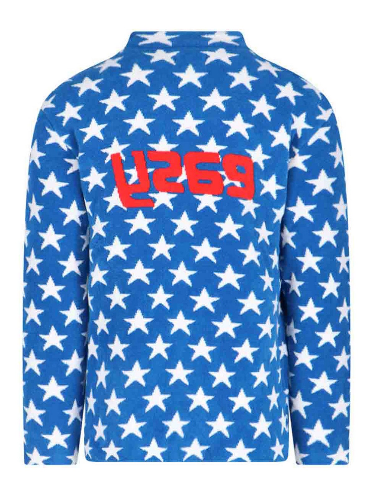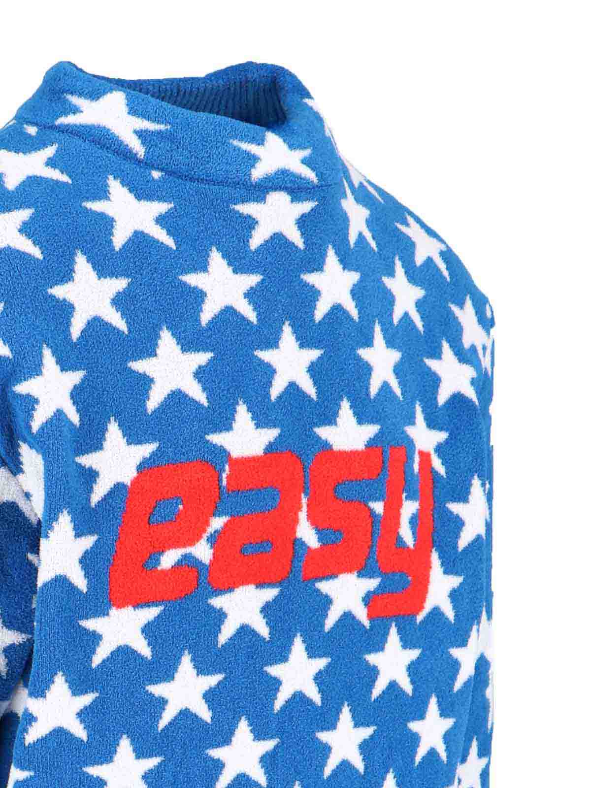 Erl fleece sweatshirt in light blue blend all-over white star motif crew neck red logo print on front ribbed finishes straight hem