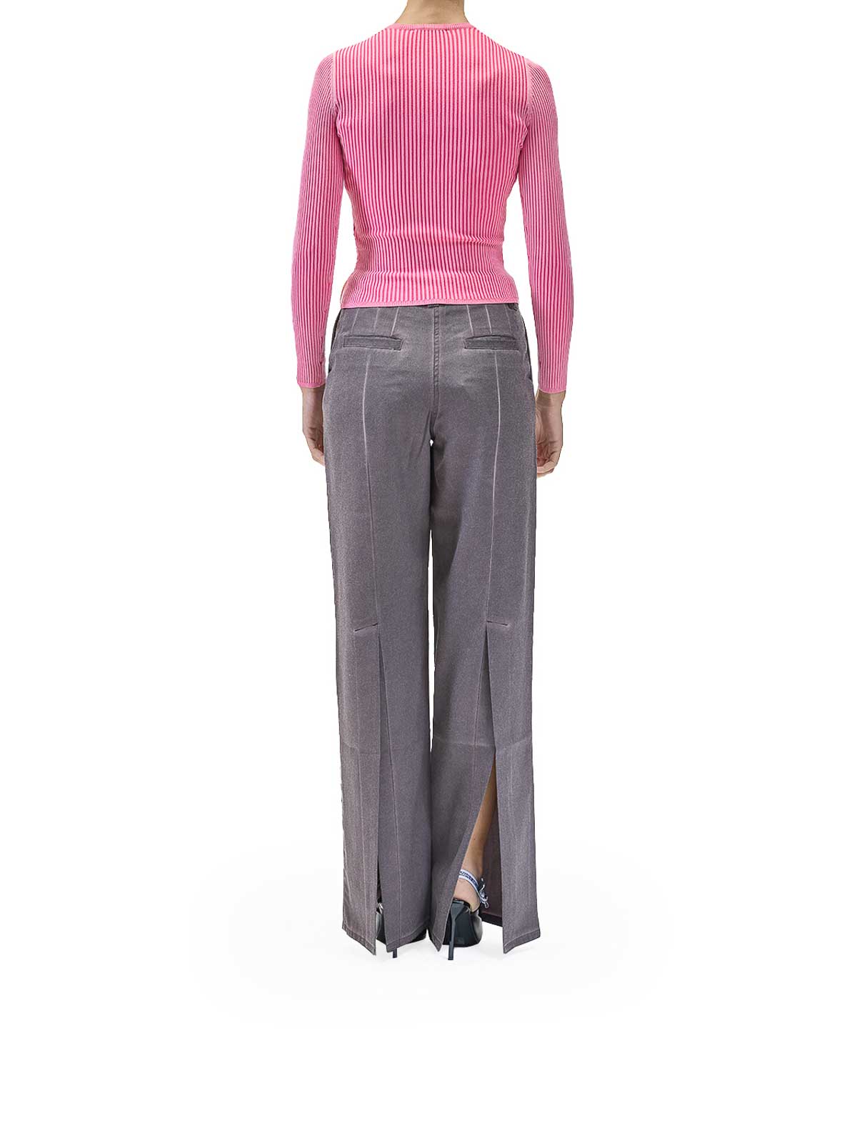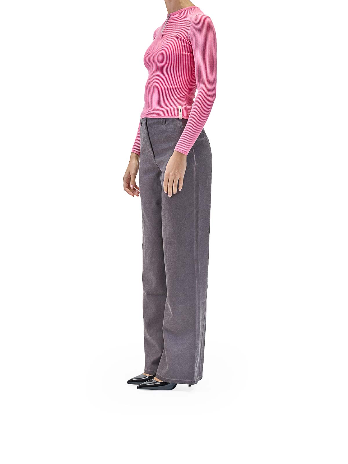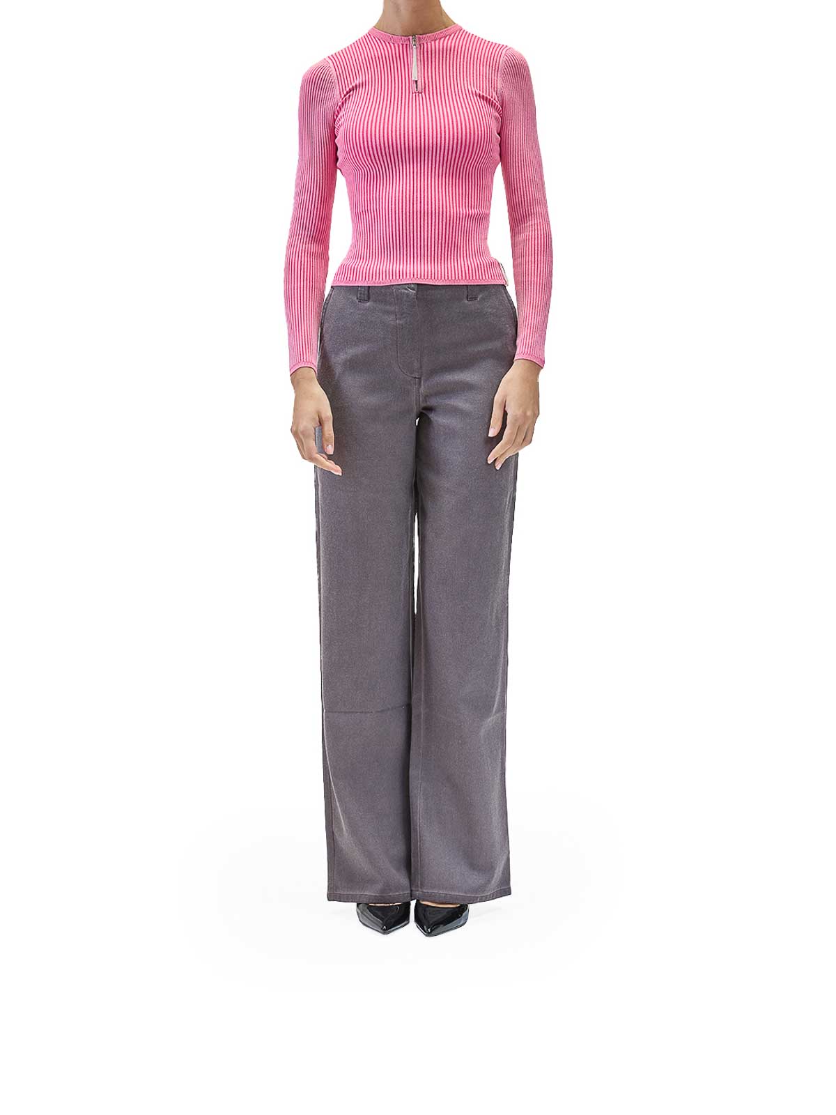 Folded top in pink. Sunnei long-sleeved crewneck top made of technical ribbed fabric. It features a zipper and zip pull at the neck and a grosgrain loop on the right back. Crewneck, zip and zip pull, ribbed knit, grosgrain loop with logo on the back. Color: pink. 59% polyamide, 37% polyester, 4% elastane. Fit: slim; for a looser fit, order one size up. Made in Italy...