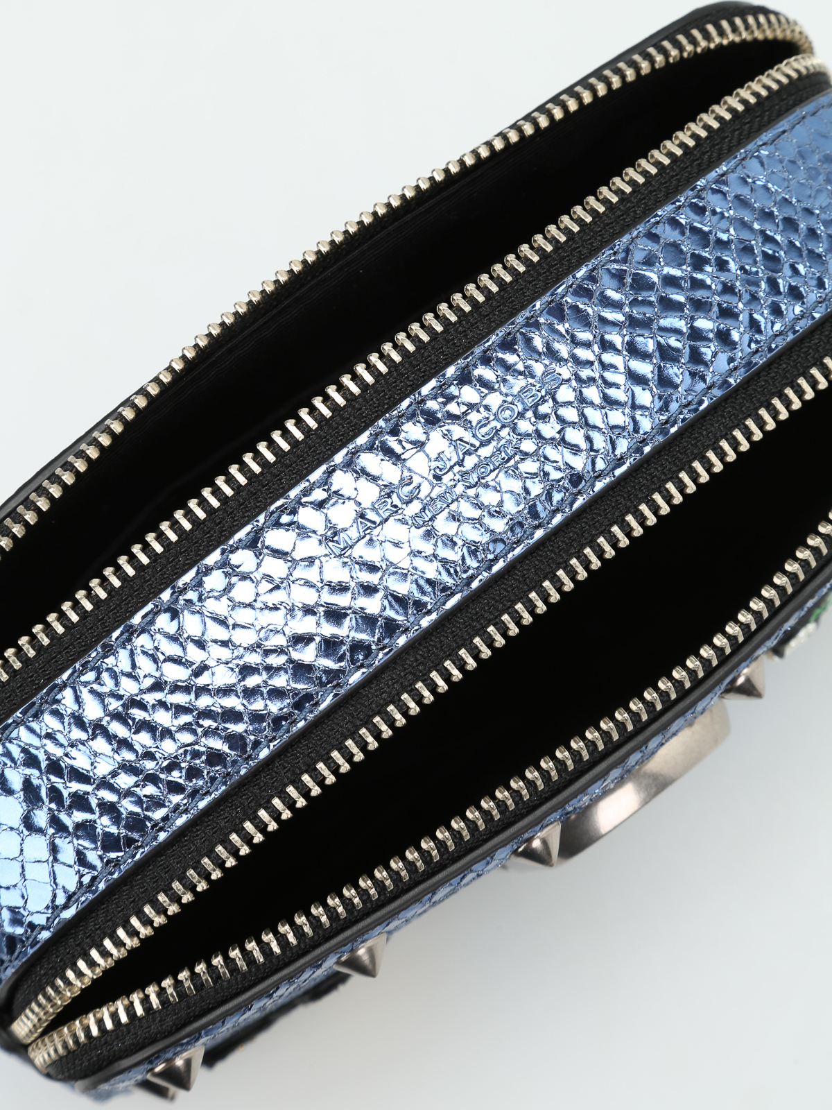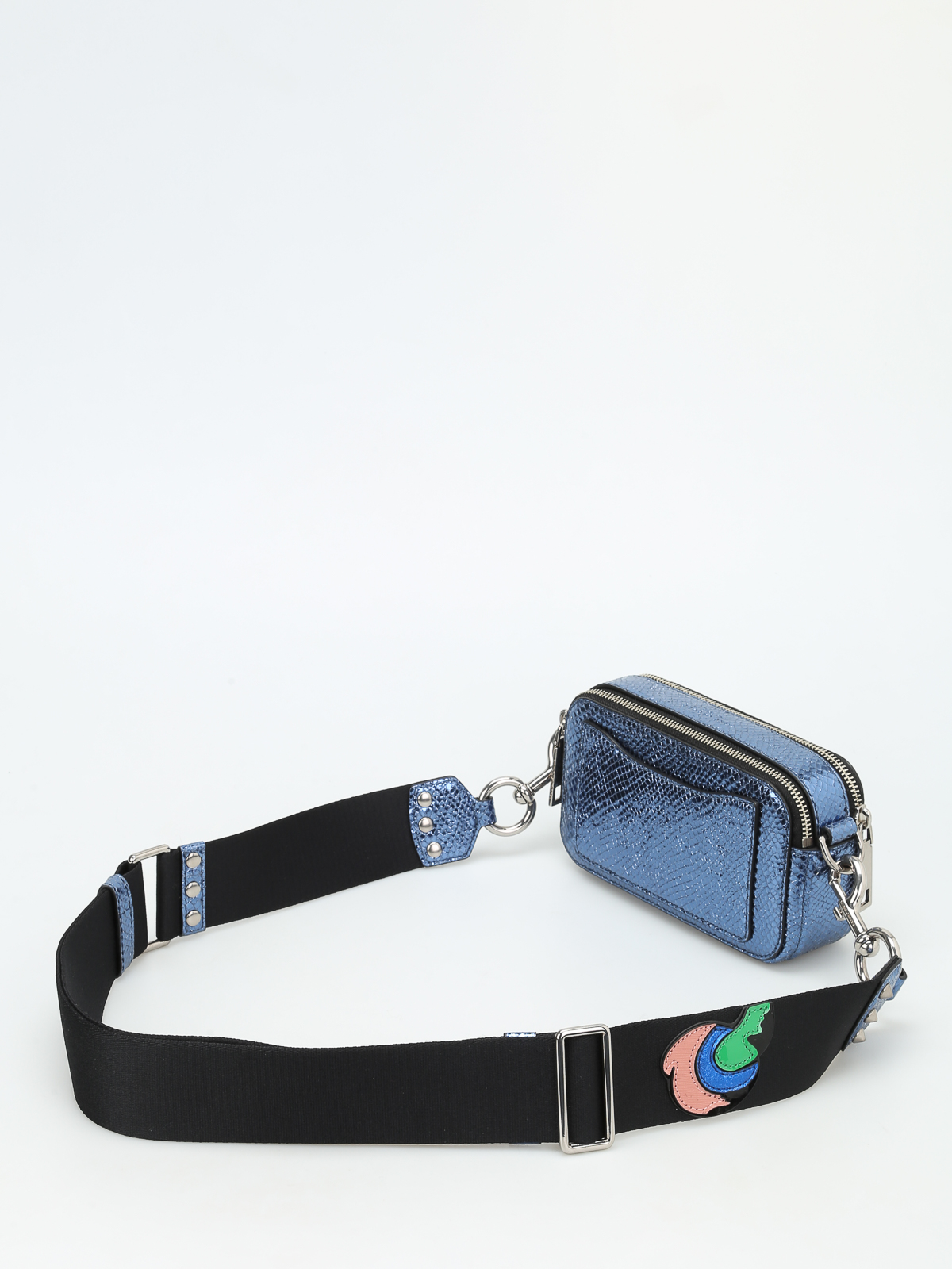 Reptile effect leather crossbody bag embellished with abstract and psychedelic patches by Julie Verhoeven, conical studs, double J on front, two zipped compartments, one inner open pocket and detachable shoulder strap.
