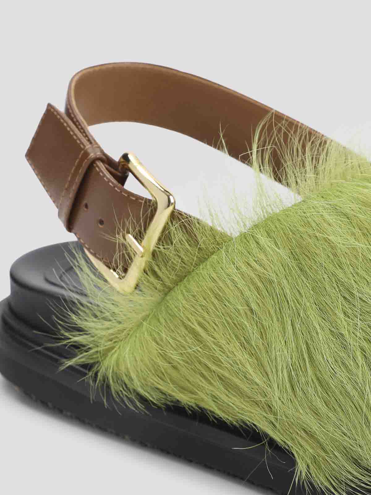 Marni fussbett brown and lime ovine leather sandals. crafted from brown leather and lime long-hair calfskin, featuring an open round toe, two crossed straps, an adjustable buckled strap on the back, an anatomical leather insole, and a black rubber outsole.