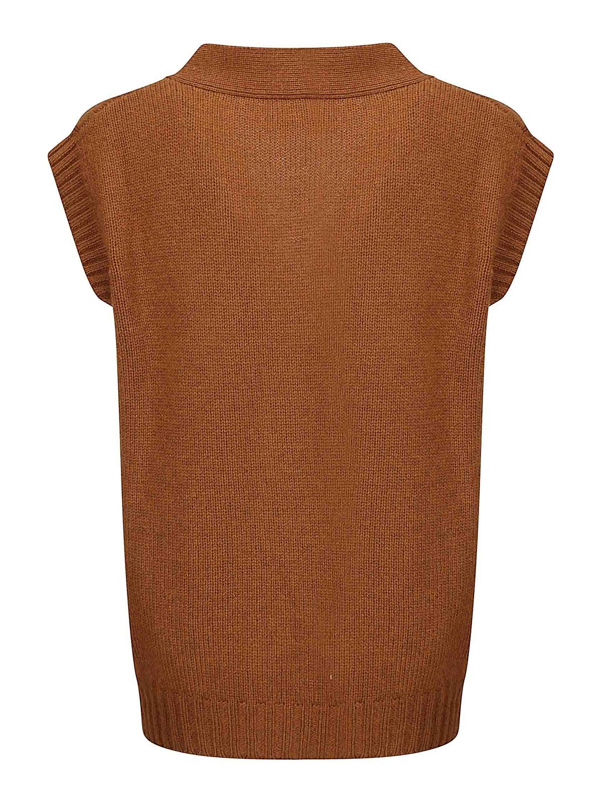 Soft cashmere waistcoat with contrasting front buttons, front pockets, deep neckline.