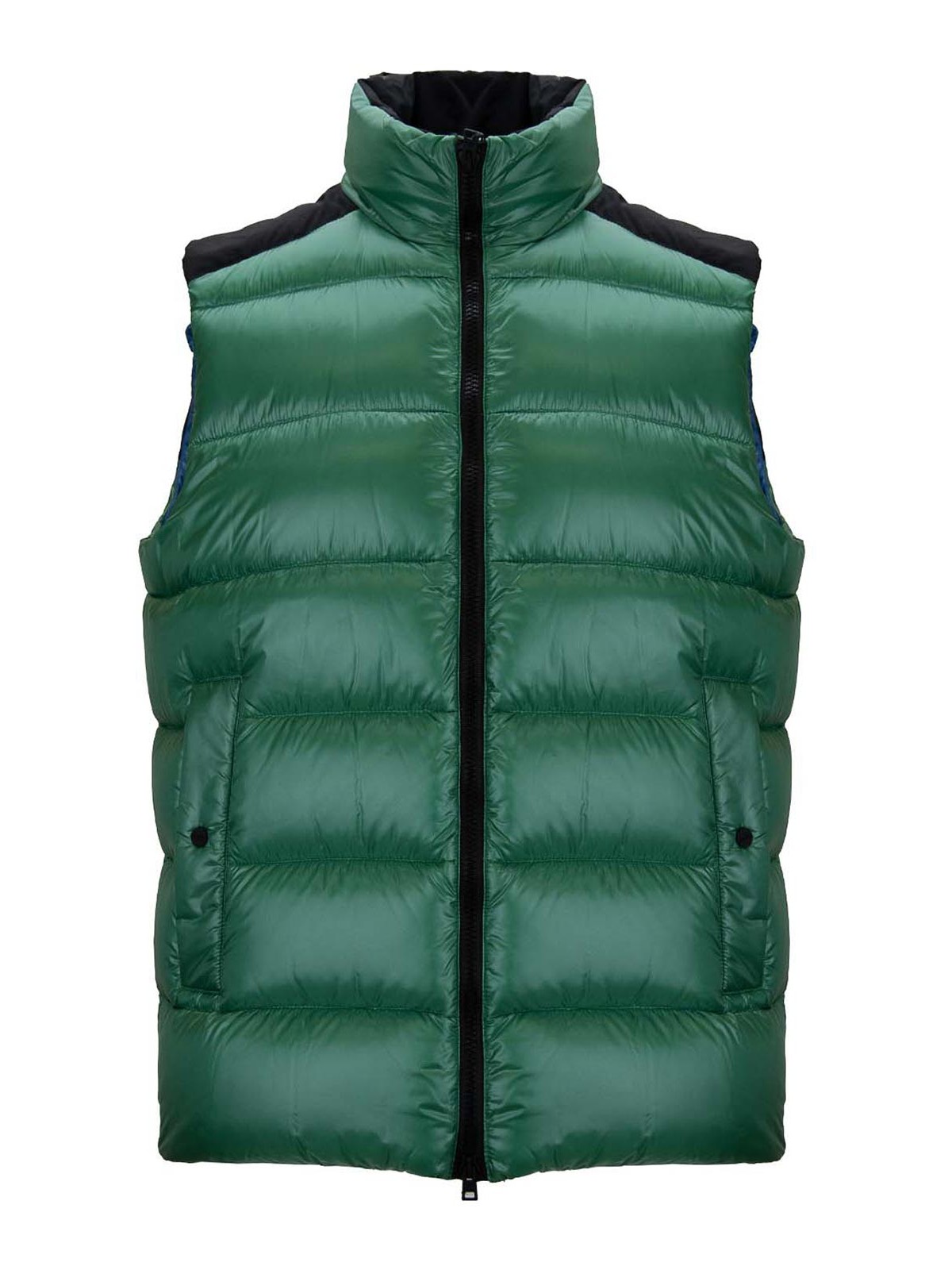 Herno men's vest. Main fabric and lining 100% in Poliamide. Secondary fabric made 100% polyester. Packaging made 90% in duvet and 10% feather. High sleeveless collar vest. lateral pockets on the front with closure via automatic button. Double cursor zipper closure.