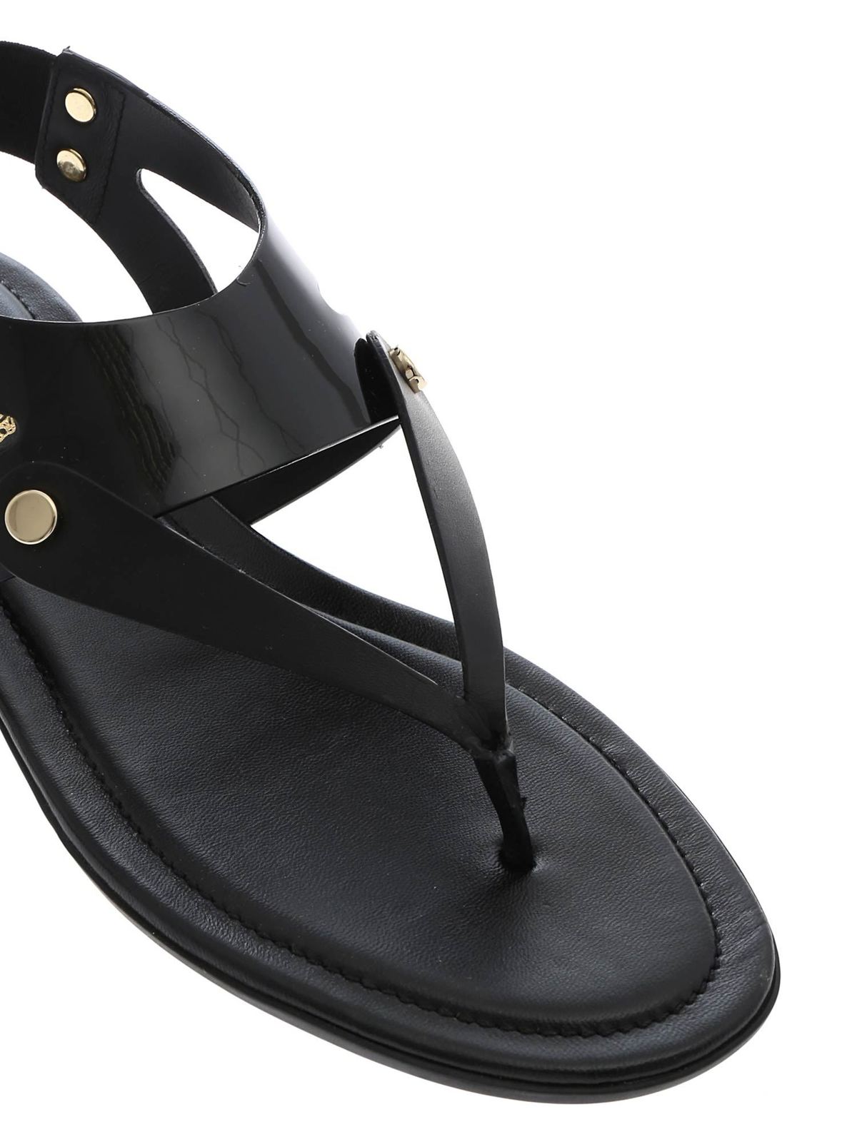 Leather sandals featuring rear elastic strap with logo, metal details and rubber sole with pads.