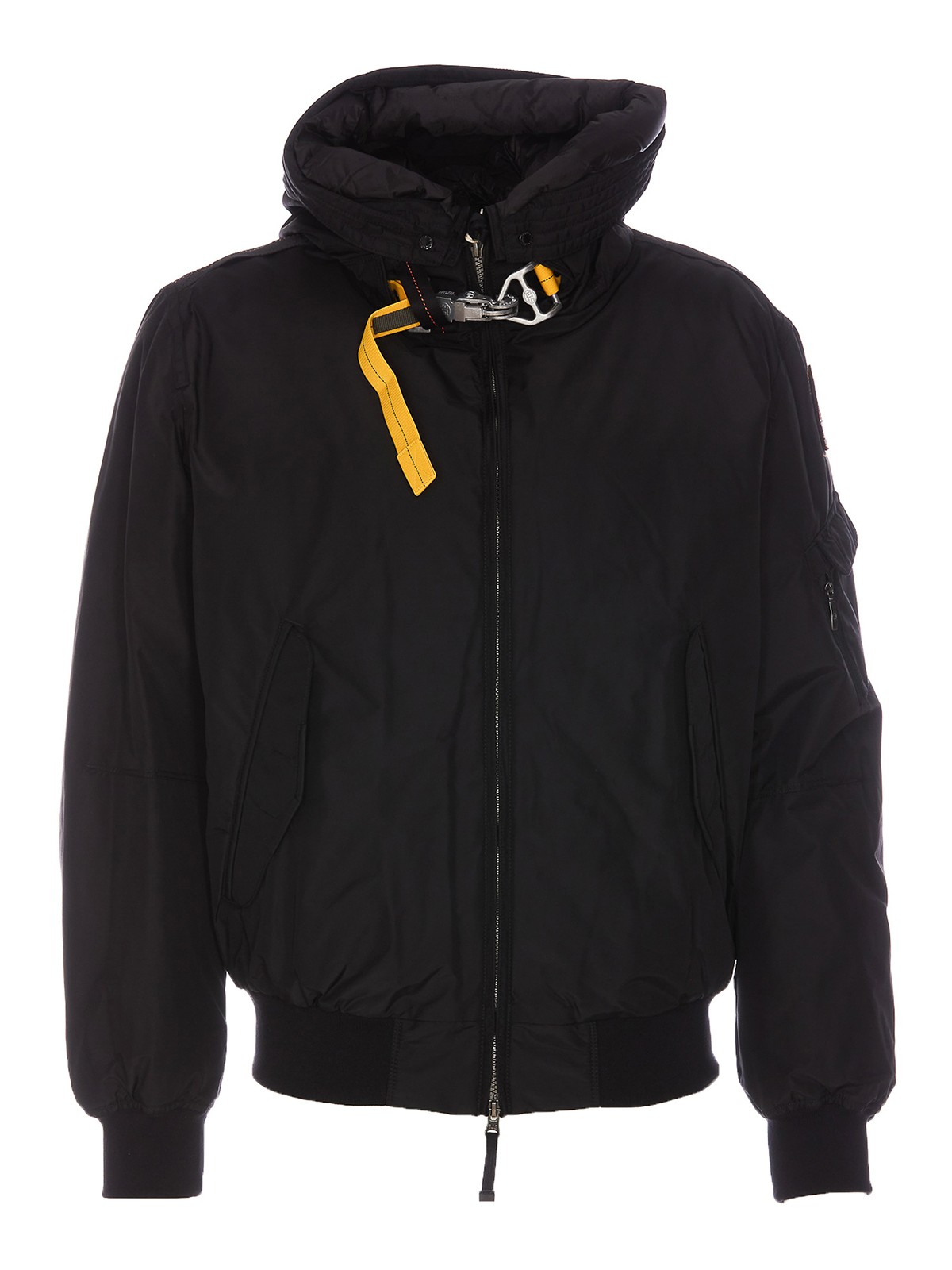 Parajumpers black gobi down jacket zip closure on the front hood detail lateral zip pocket patch logo on sleeves elasticized on cuffs hook metal detail on collar lateral button pockets elasticized on waist