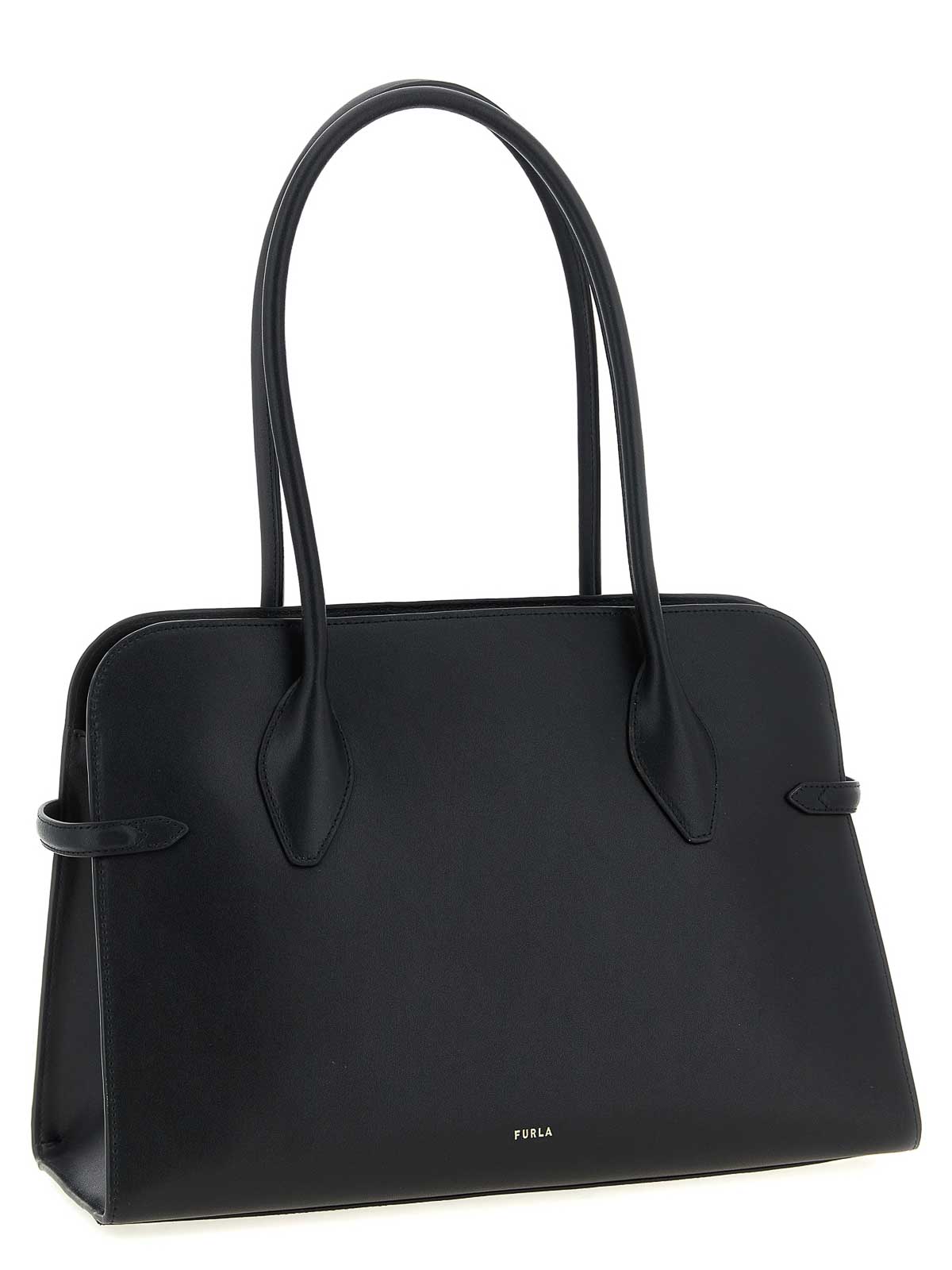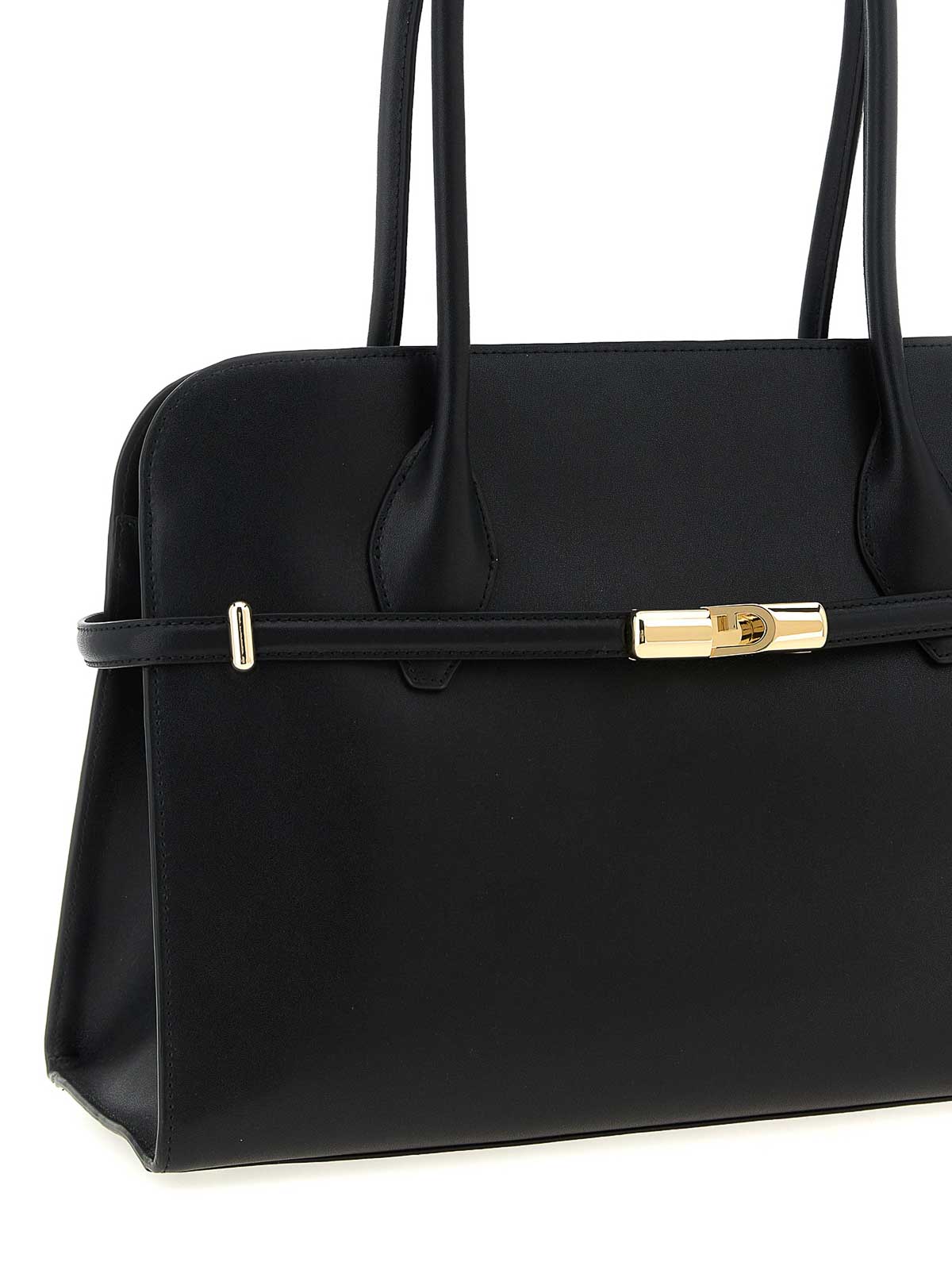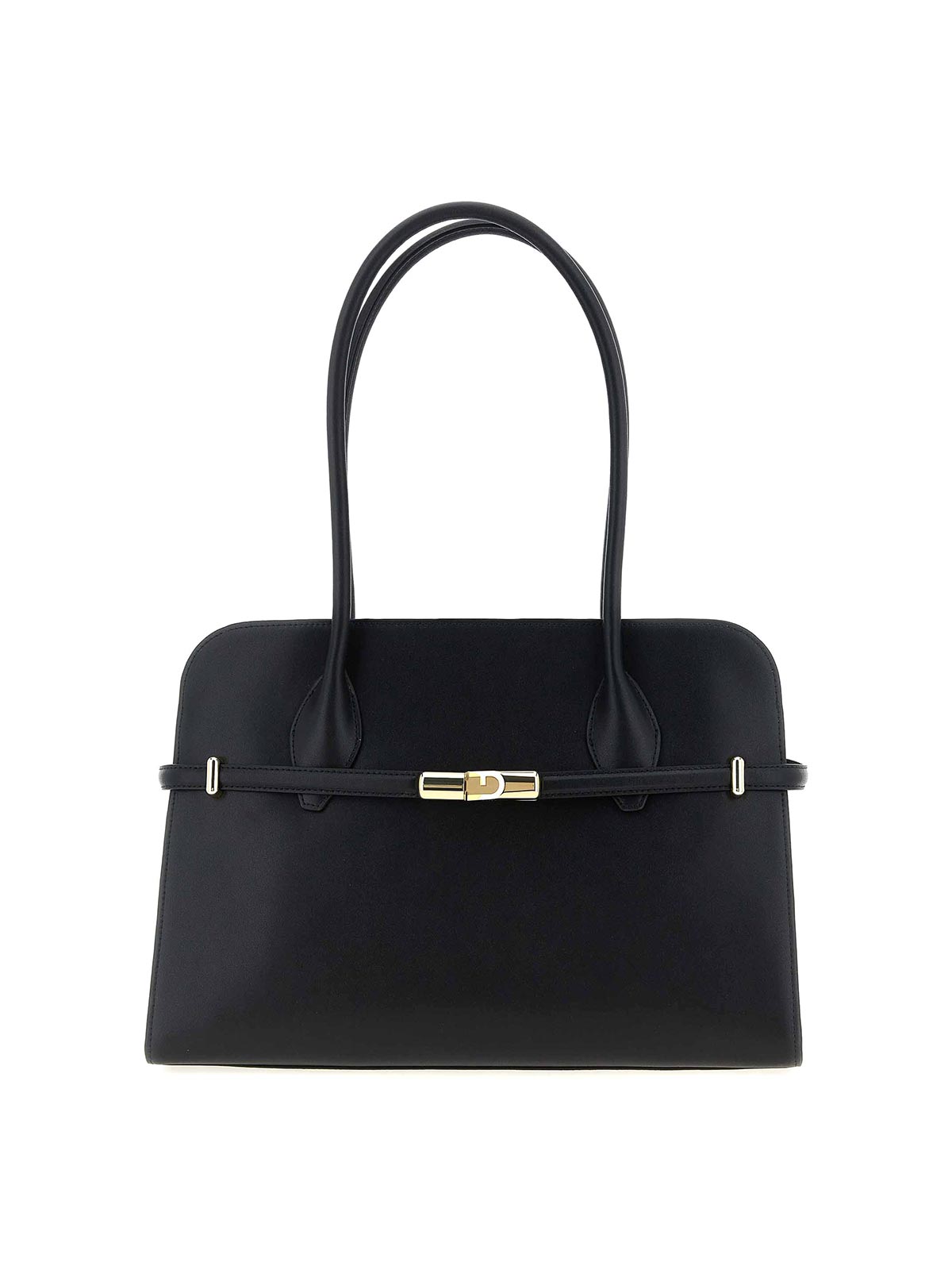 furla goccia dome l' shoulder bag in smooth leather, front belt detail with cylindrical hardware glossy finish with arco logo, double fixed handle, top zip closure, metal details.