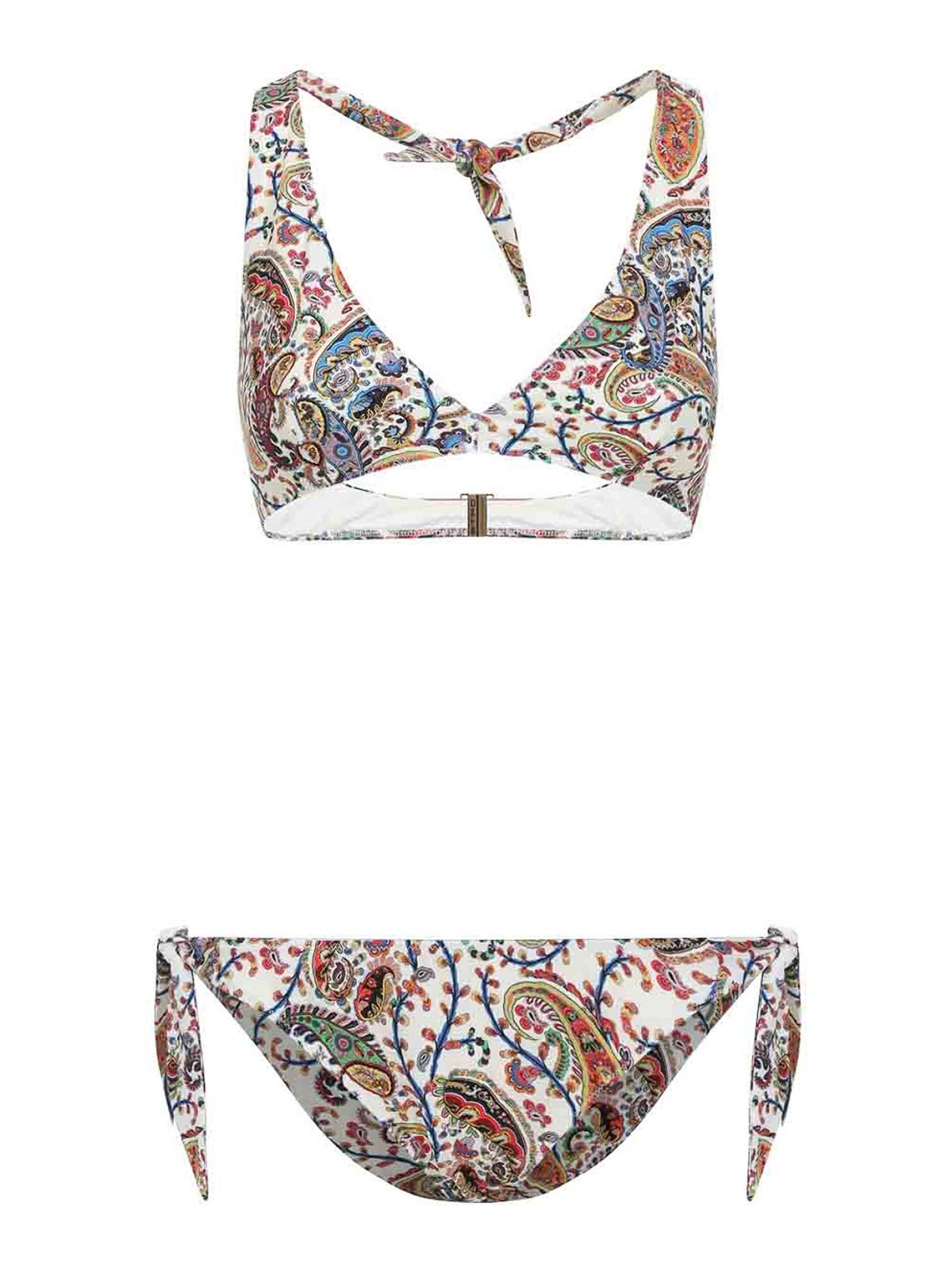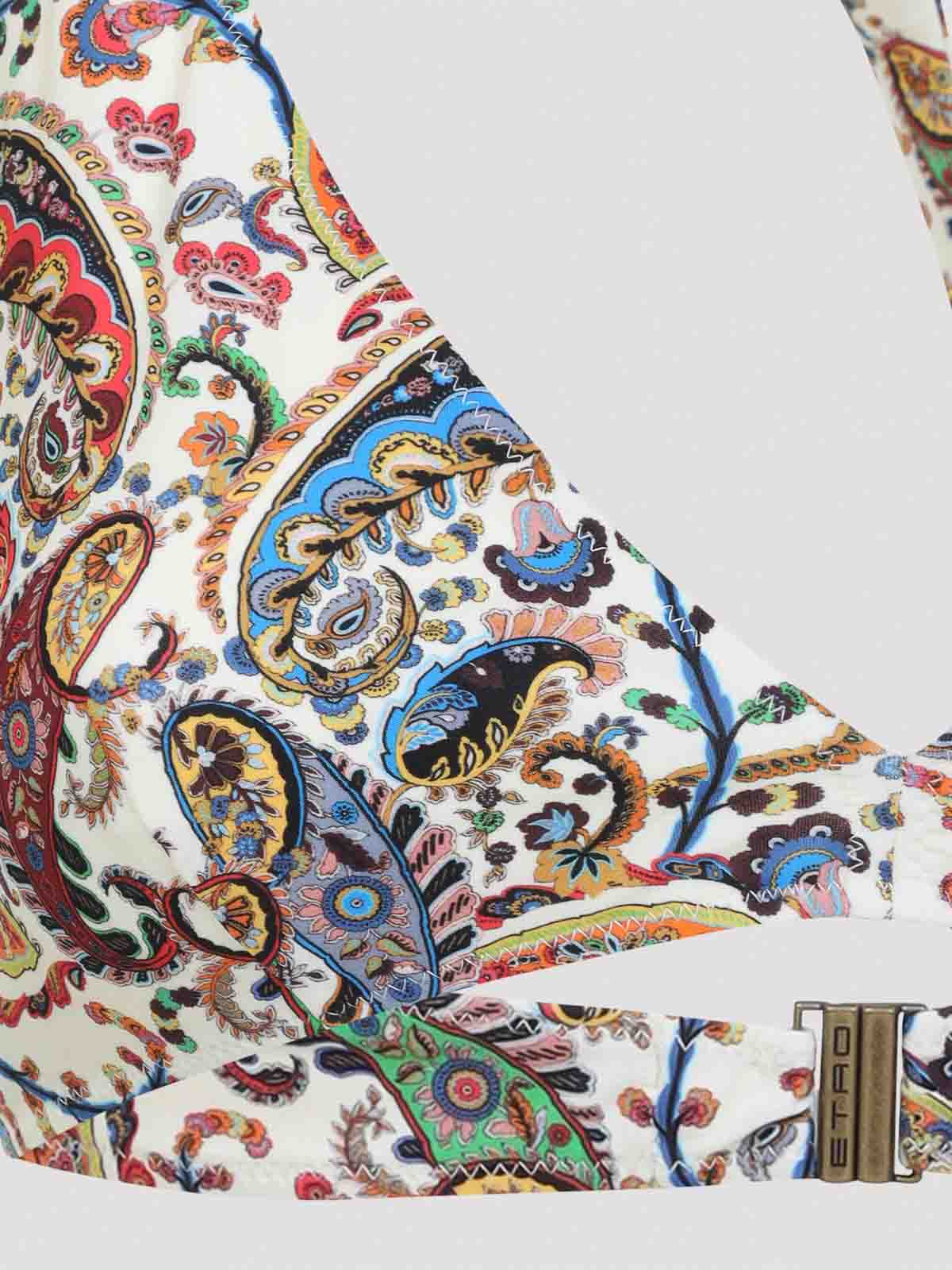 Etro halter neck white polyamide bikini. two-piece crafted from white tech fabric with an all-over floral paisley print. the top featuring a halterneck, a self-tie fastening at the back of the collar, and a hook fastening on the back. the regular fit briefs have a self-tie fastening on the sides, a low waist, and a full lining.