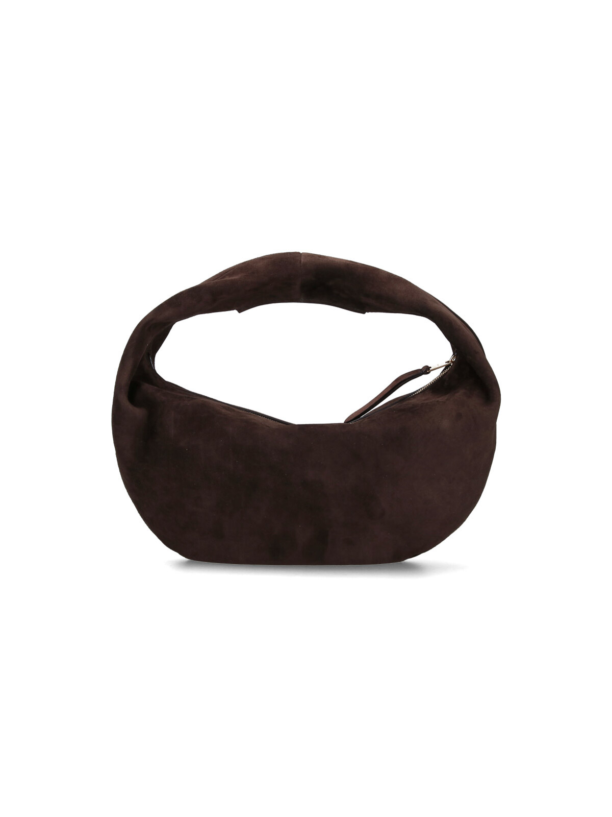 Khaite olivia hobo bag in brown suede leather, dark shade, top handle, zip closure, zip puller, one main internal compartment.
