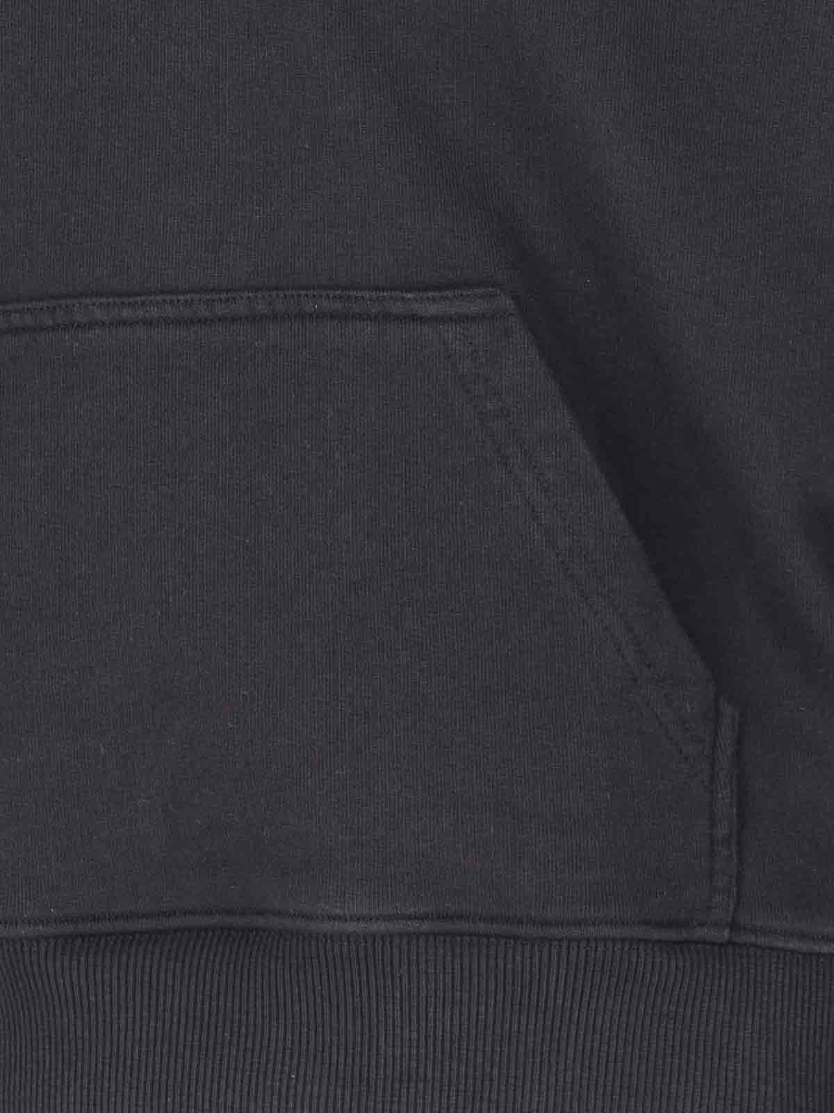Hooded sweatshirt toplayer c black drawstring chest white logo one maxi front pocket ribbed trims straight hem