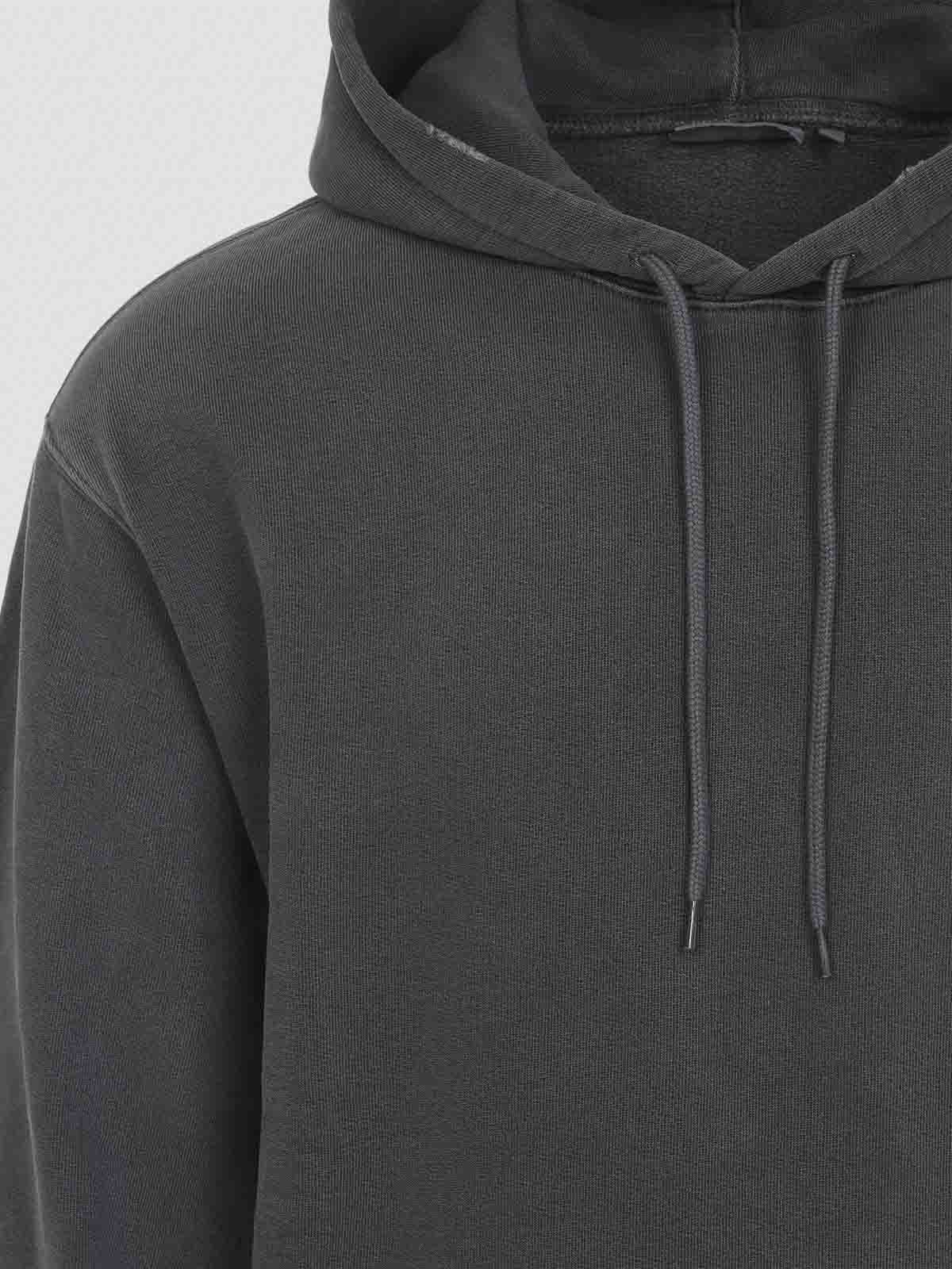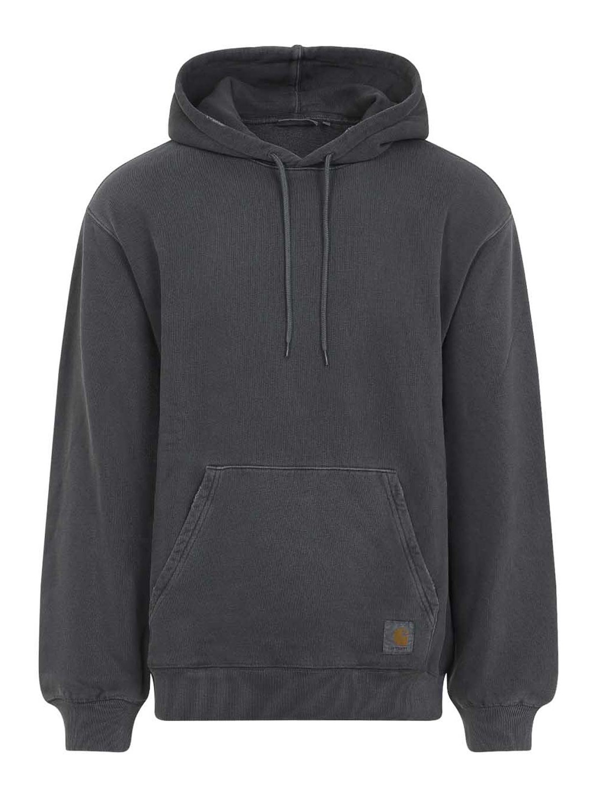 Carhartt wip hooded torion black cotton hoodie. crafted from washed black cotton jersey, hood with drawstring, kangaroo pocket with logo patch detail, dropped shoulders, ribbed edges, balloon fit.