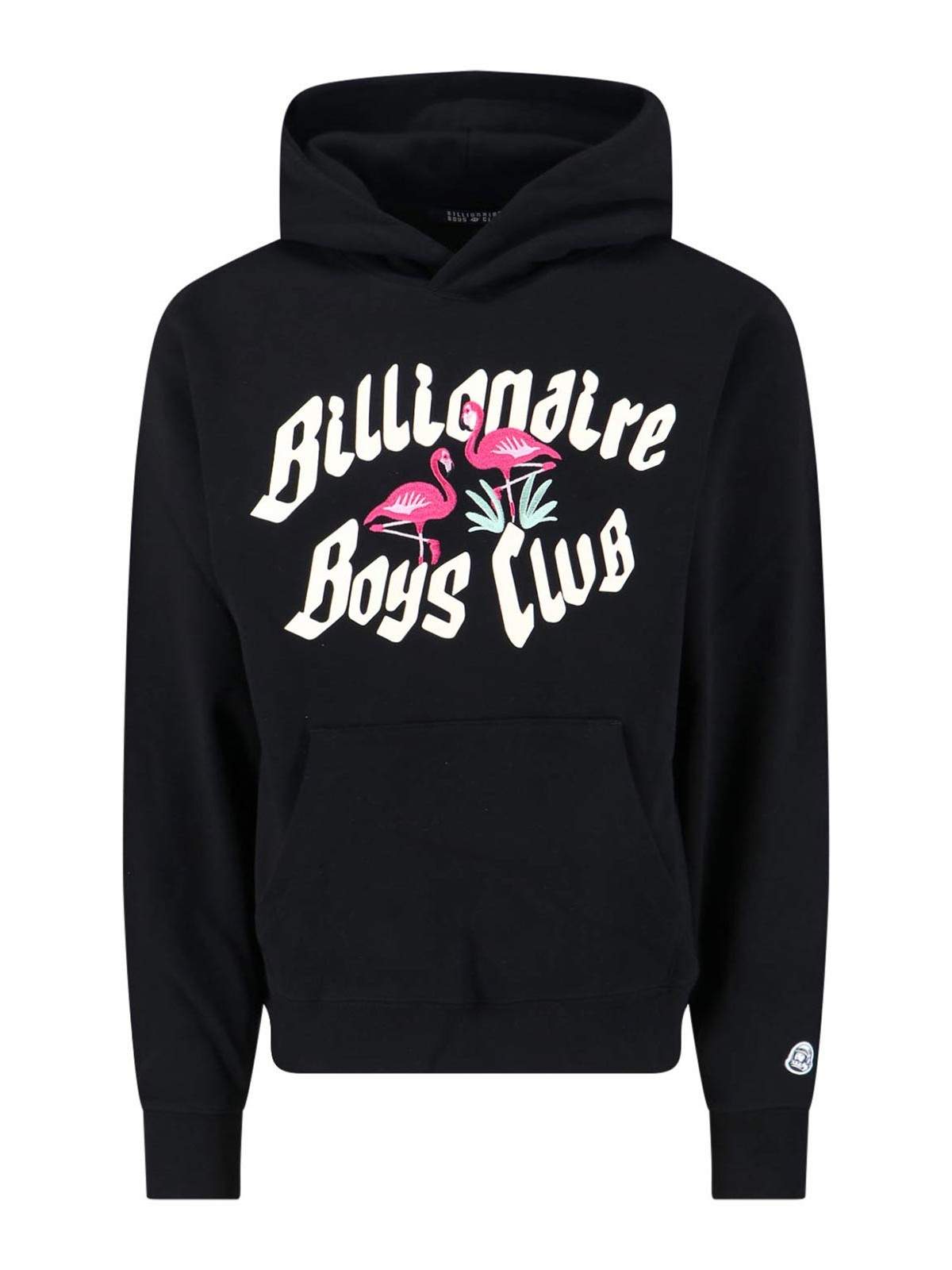 flamingo billionaire boys club hoodie, in black cotton, maxi multicolor print on the front, embroidered flamingo detail, maxi pocket on the front, logo print on the sleeve, logo print on the back, ribbed finishes, straight hem.