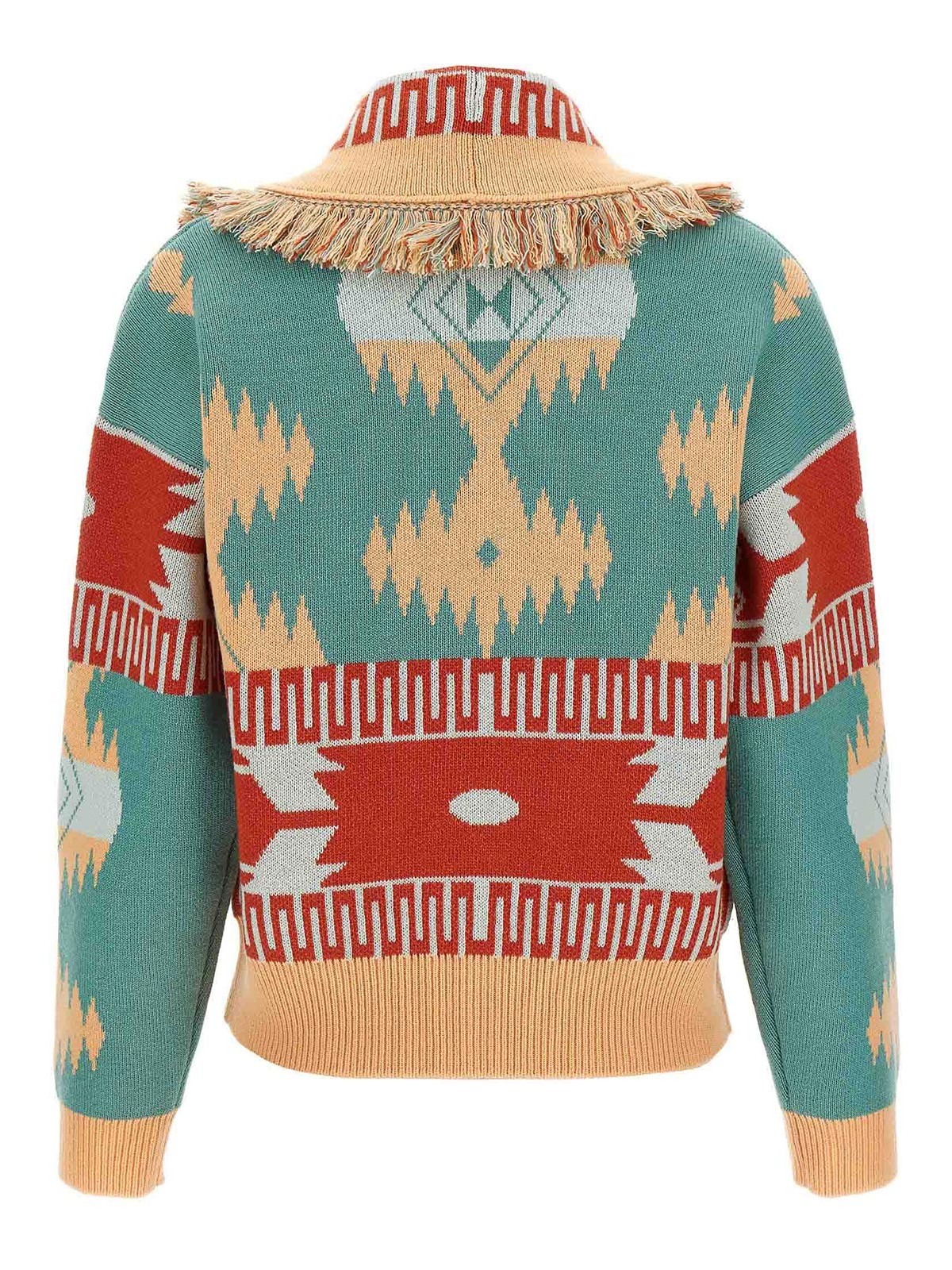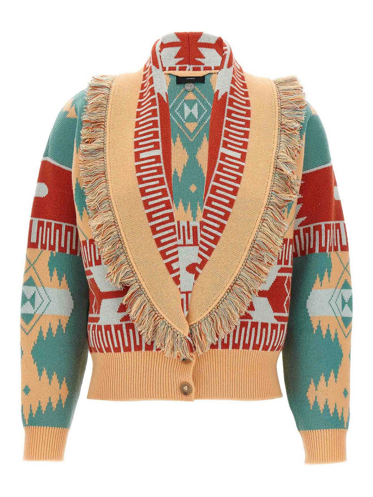 Cashmere and virgin wool cardi-bomber jacket with double jacquard 'alanui' pattern, bomber cardigan, shawl collar with fringes, front button closure, long sleeves with cuffs and dropped shoulder.