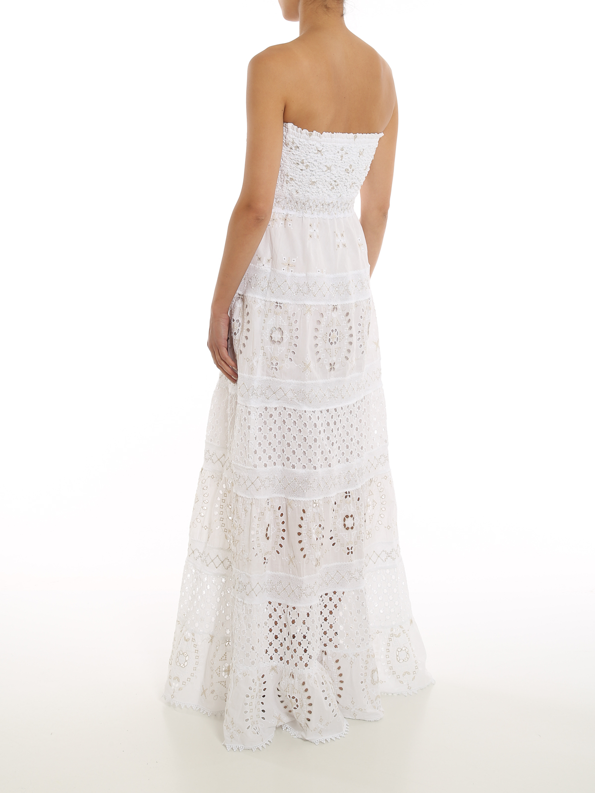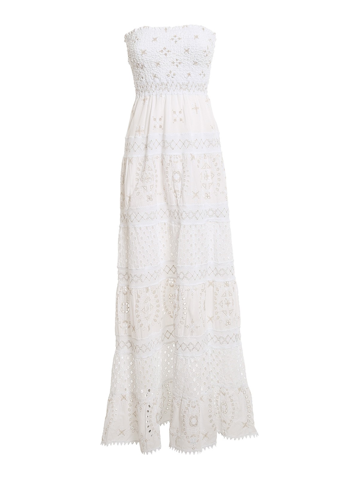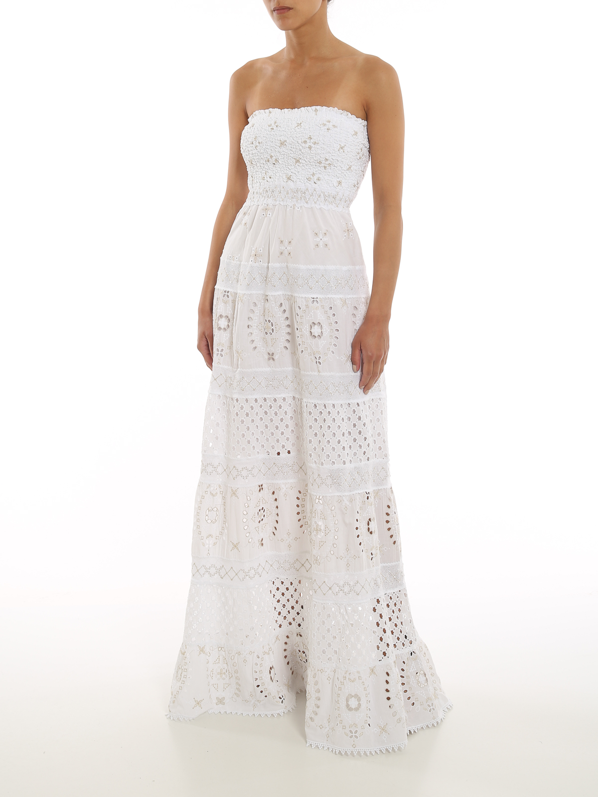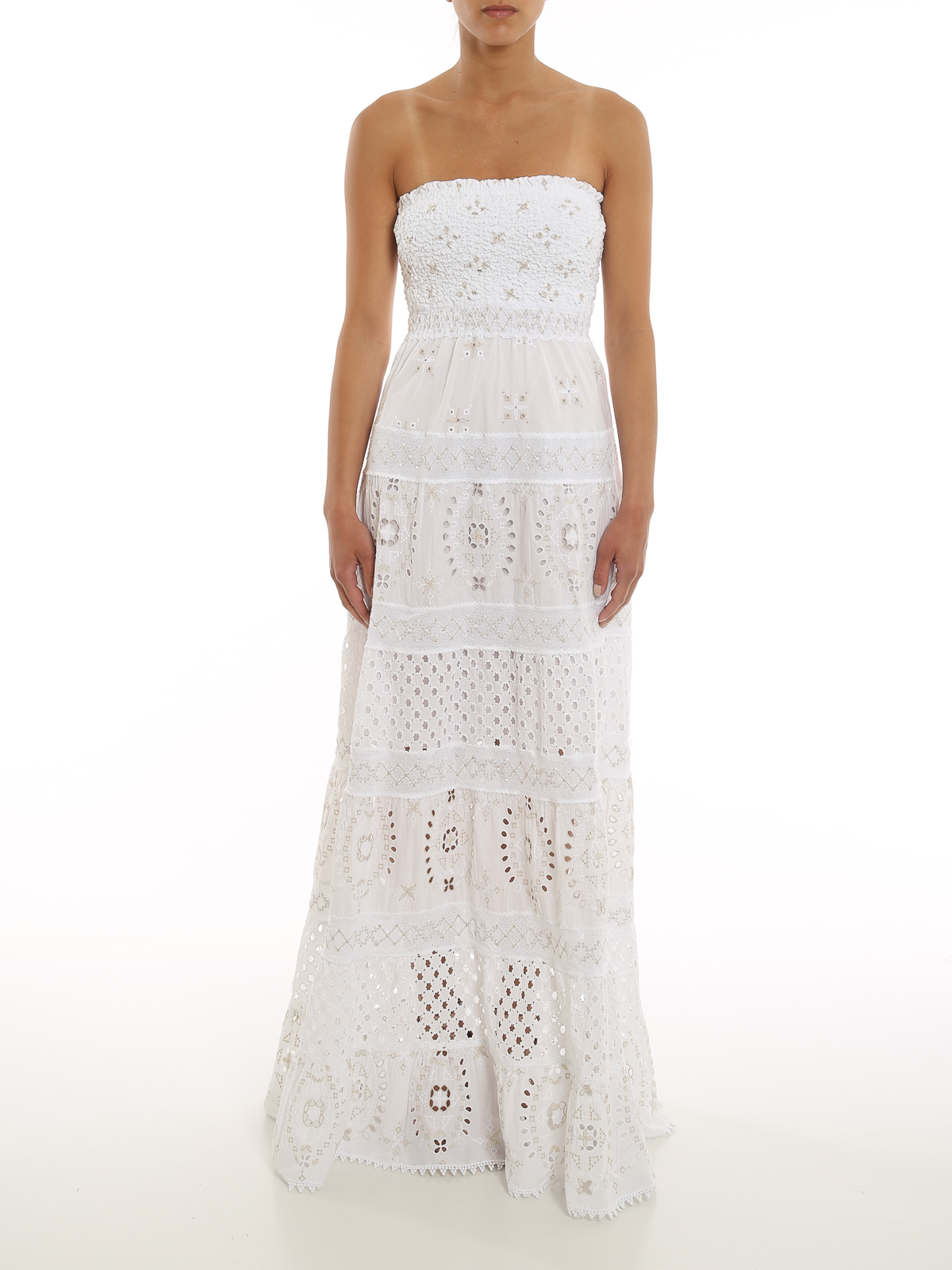 Embroidered cotton off-the-shoulder long dress detailed with lurex and smocked top.