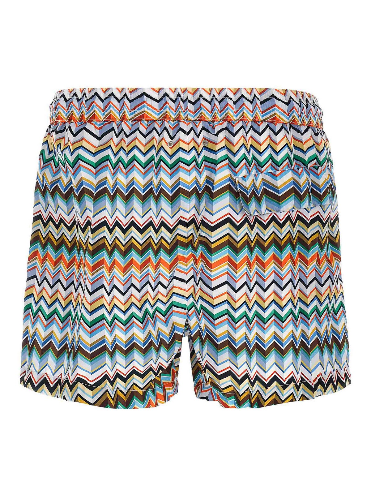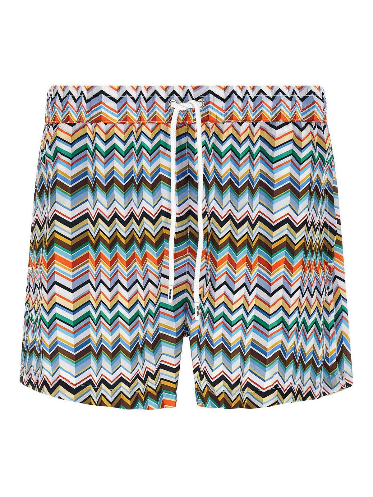 Swimsuit in technical fabric with irregular zigzag print, medium length, elastic waistband with drawstring, pockets, inner mesh briefs.