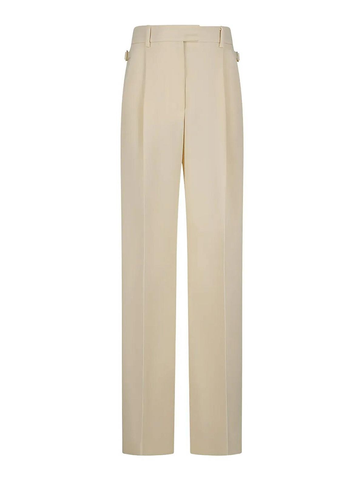 Pt Torino cream virgin wool trousers, palazzo style, side pockets, back welt pockets, zip and hook closure.