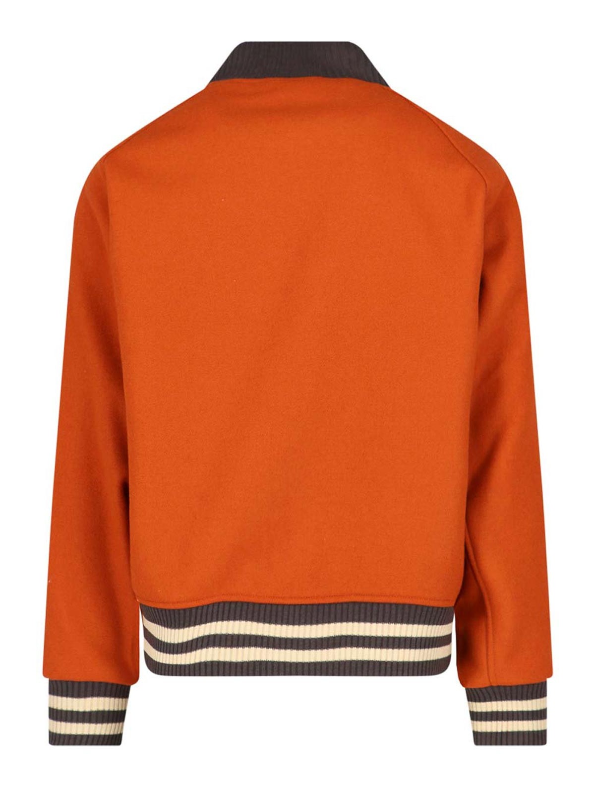 Awake varsity jacket in orange brown ribbed knit trim front cream logo patch buttons two front welt pockets straight hem