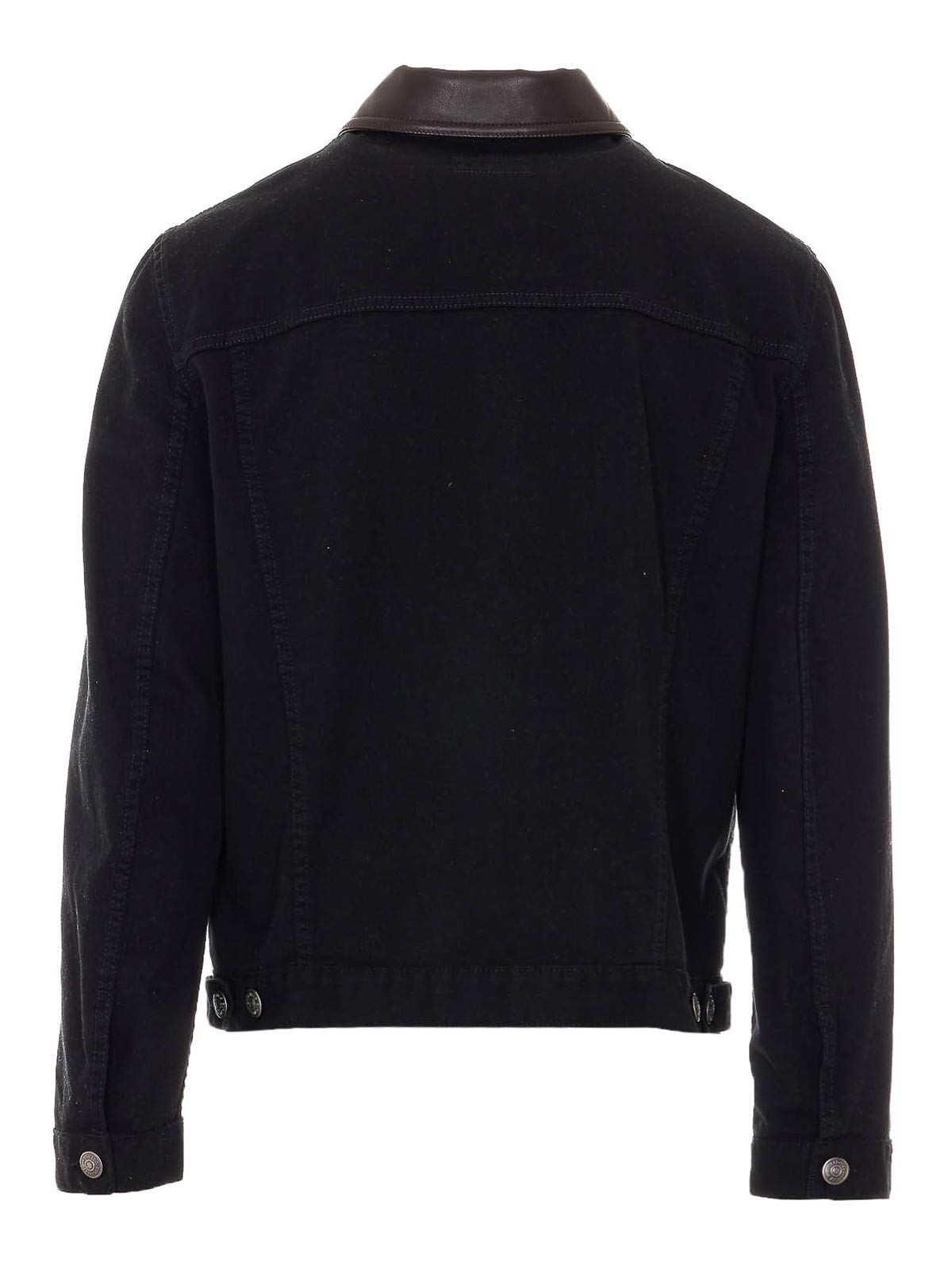 Brunello cucinelli black denim jacket with frontal buttons closure, leather collar, long sleeves, pockets