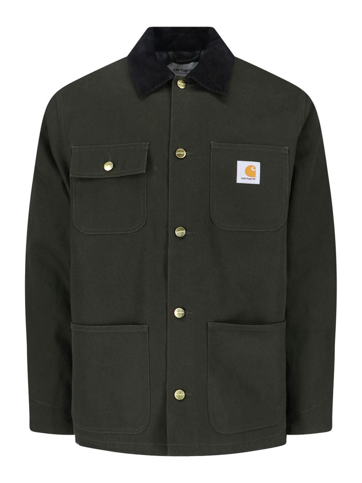 Carhartt wip michigan jacket, in green cotton, classic velvet collar, button cuffs, two chest button pockets, applied logo label, two side patch pockets, straight hem.