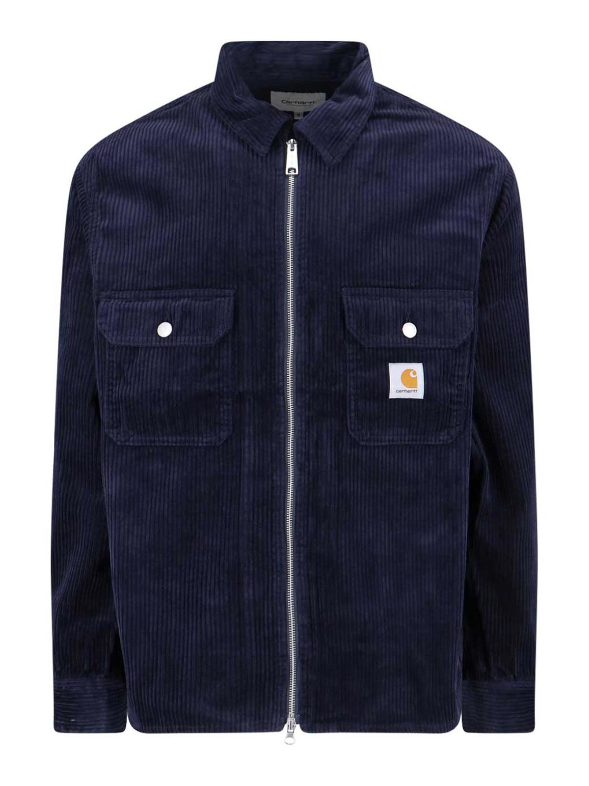 Reynold Carhartt WIP jacket, in blue cotton, navy shade, classic collar, silver metal zip closure, two front button pockets, contrasting logo patch detail on the front, buttons on the cuffs, straight hem.