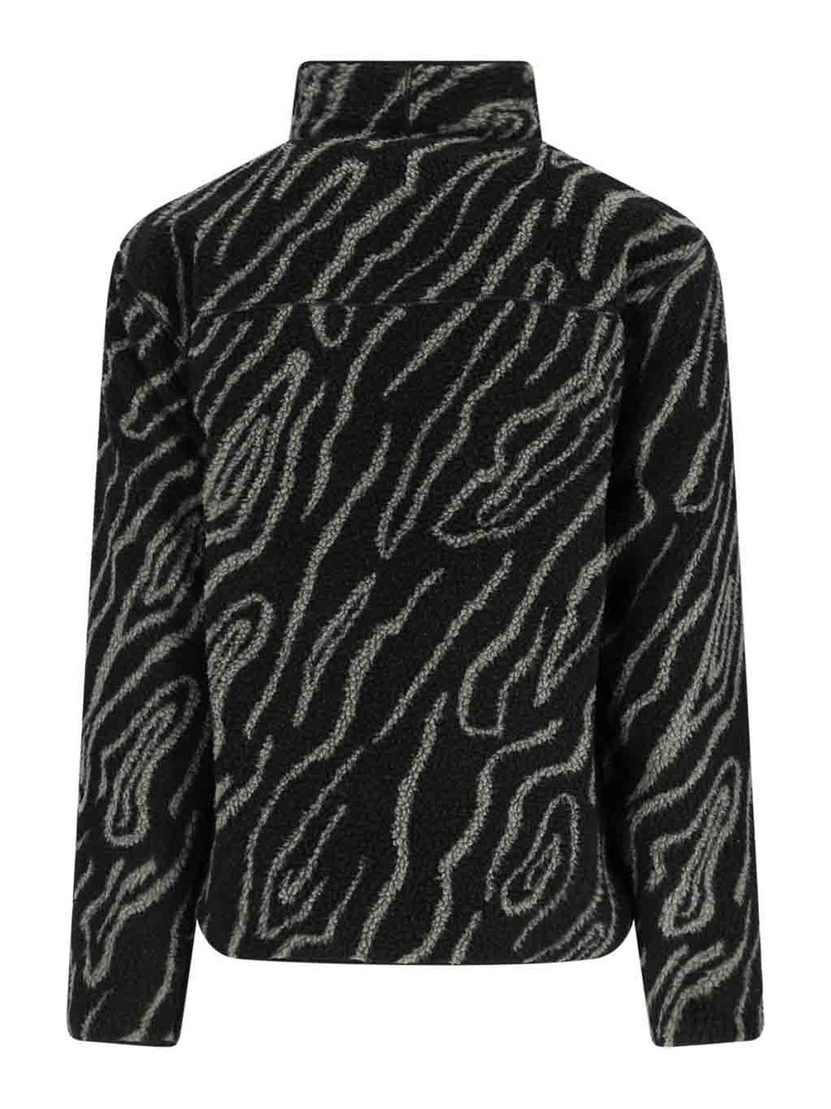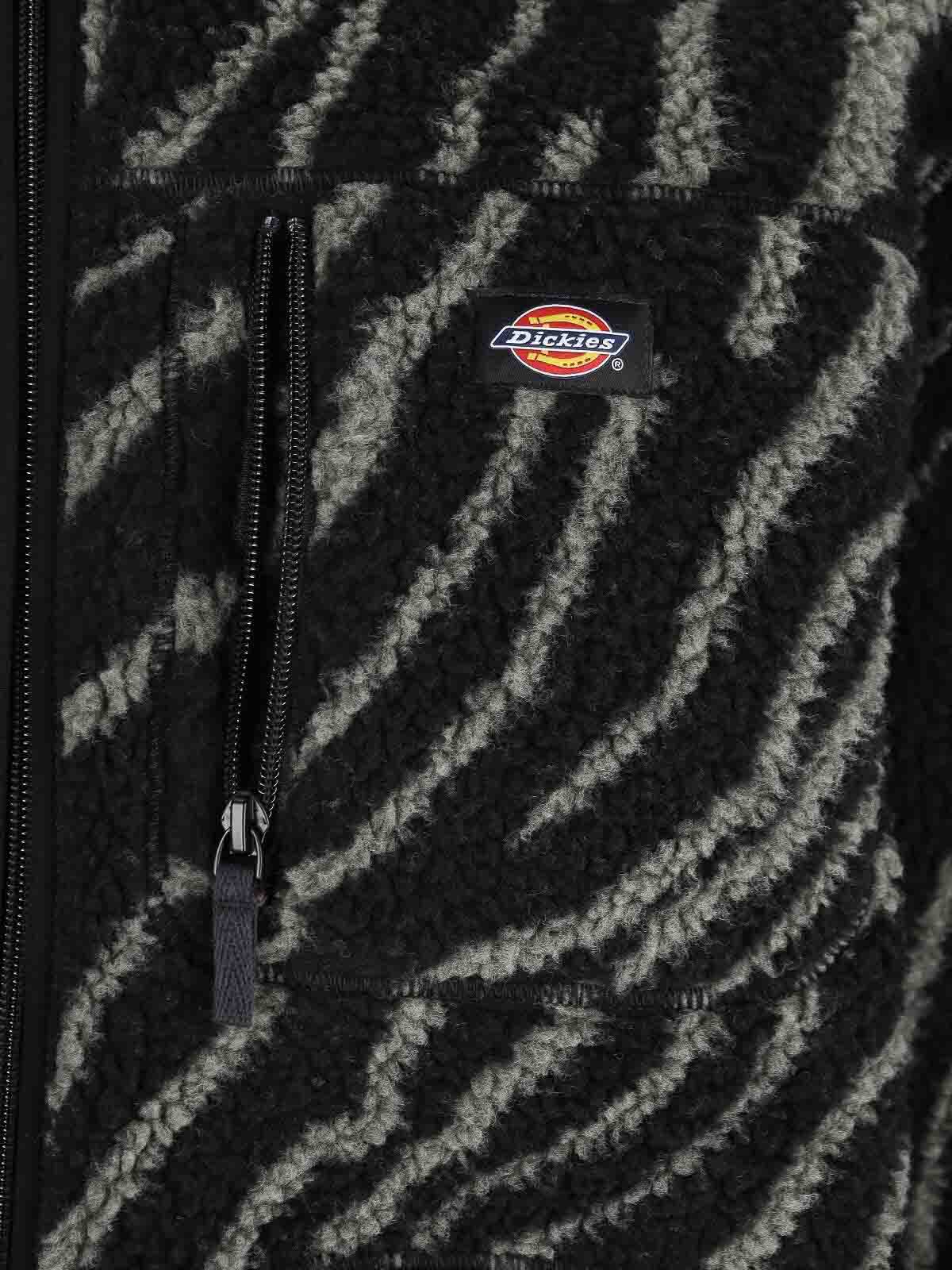 Dickies mount hope jacket, in black fleece, animalier motif with green details, high collar, zip closure, one chest zip pocket with applied logo patch detail, two side pockets, elasticated bottom and cuffs, straight hem.